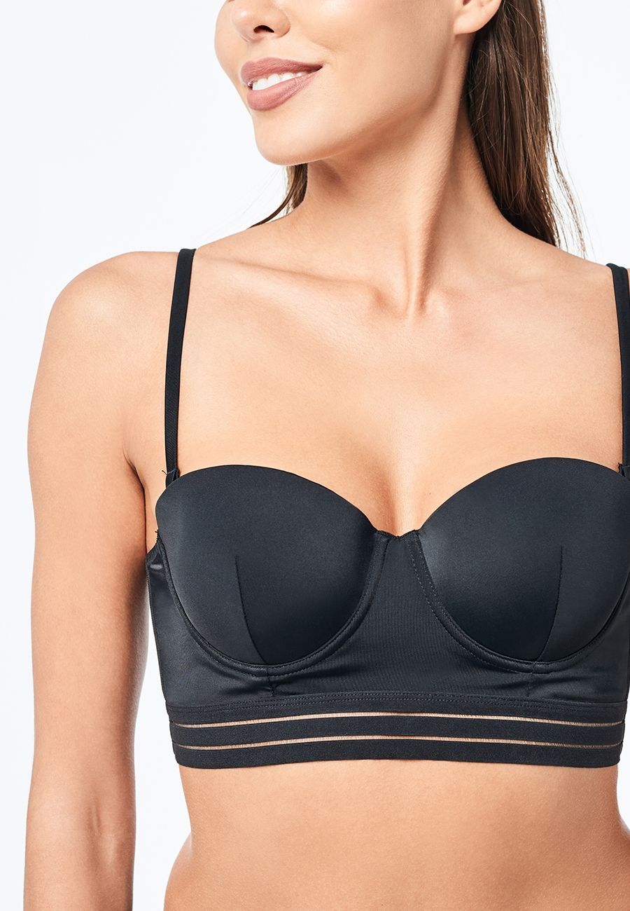 Купальник чёрного цвета из эластичного полотна и фигурными вставками из сетки. Бюстгальтер бандо с формованной чашкой и удобной пластиковой застёжкой сзади. Съёмные бретели регулируются по длине. Плавки с завышенной талией на подкладке. Комплект декорирован эластичной лентой по низу лифа и по поясу трусиков.