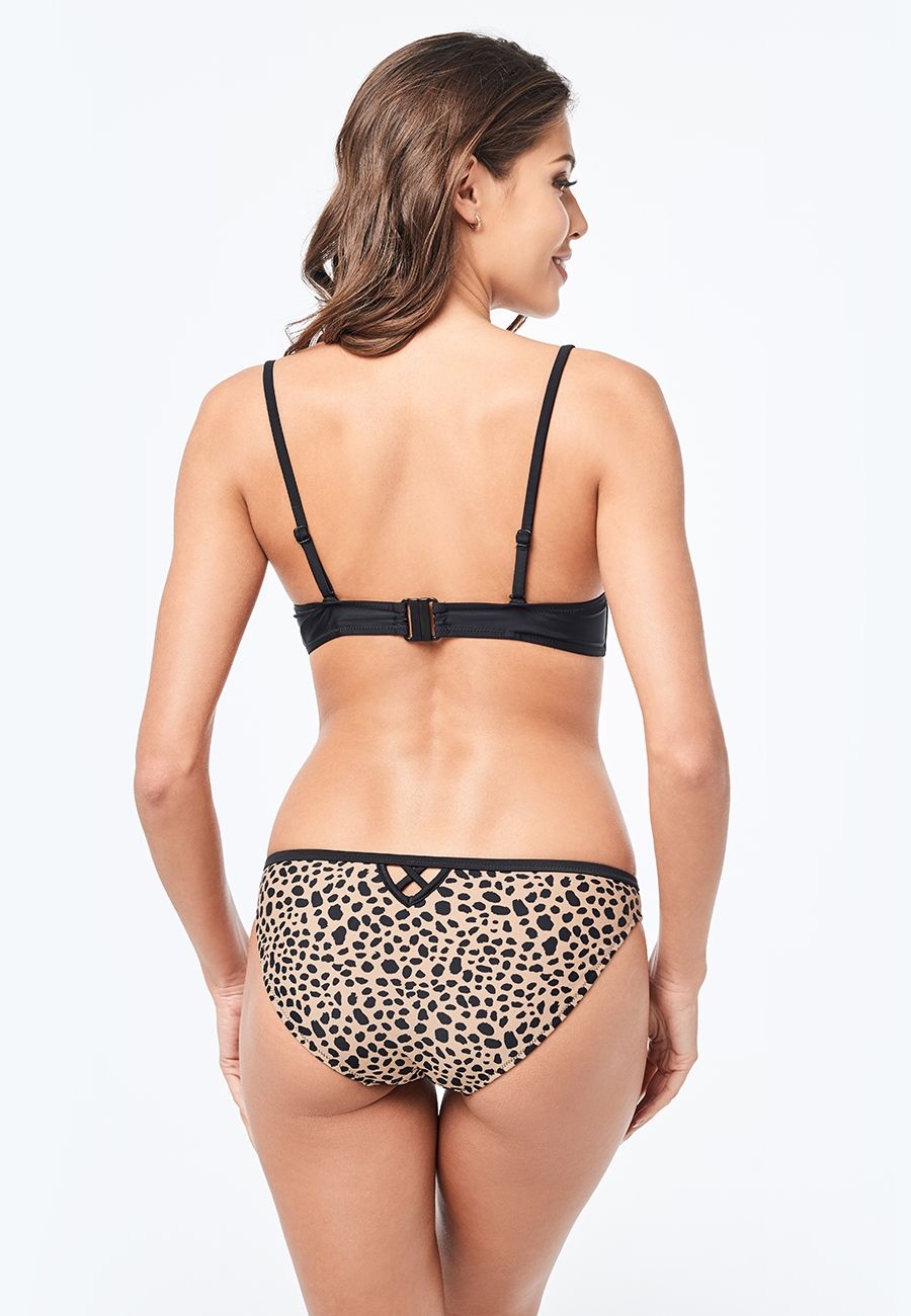 Купальник из эластичного полотна с трендовым леопардовым принтом на трусиках. Бюстгальтер балконет с формованной чашечкой push-up во всех размерах и удобной пластиковой застёжкой сзади. Два комплекта съёмных регулируемых бретелей: классические и декоративные с фигурной шнуровкой и золочёными бусинами на кокетке. Плавки на подкладке с деликатным элементом сзади.
