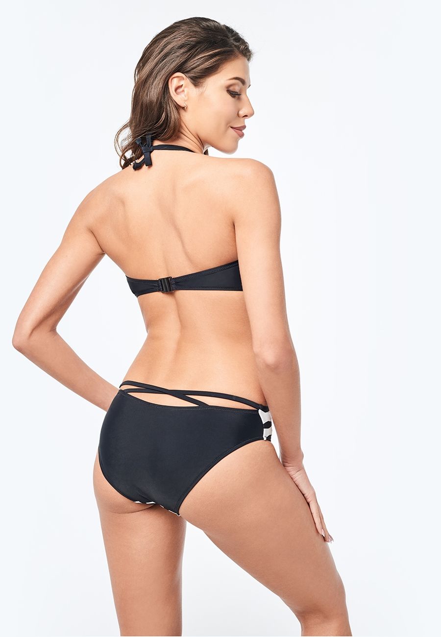 Купальник из эластичного полотна с ярким контрастным принтом в этническом стиле. Бюстгальтер имеет мягкую чашку со съёмным формованным вкладышем и удобную пластиковую застёжку сзади. Съёмные бретели завязываются на шее. Плавки на подкладке украшены сзади декоративной шнуровкой.