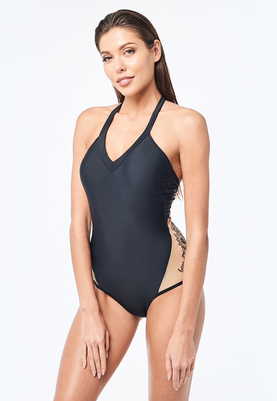 Слитный купальник чёрного цвета из эластичного полотна с V-образной формой выреза и декоративными деталями из контрастной сетки с вышивкой на спинке. Лиф имеет мягкую чашку со съёмными формованными вкладышами и завязки на шее. Купальник на подкладке.