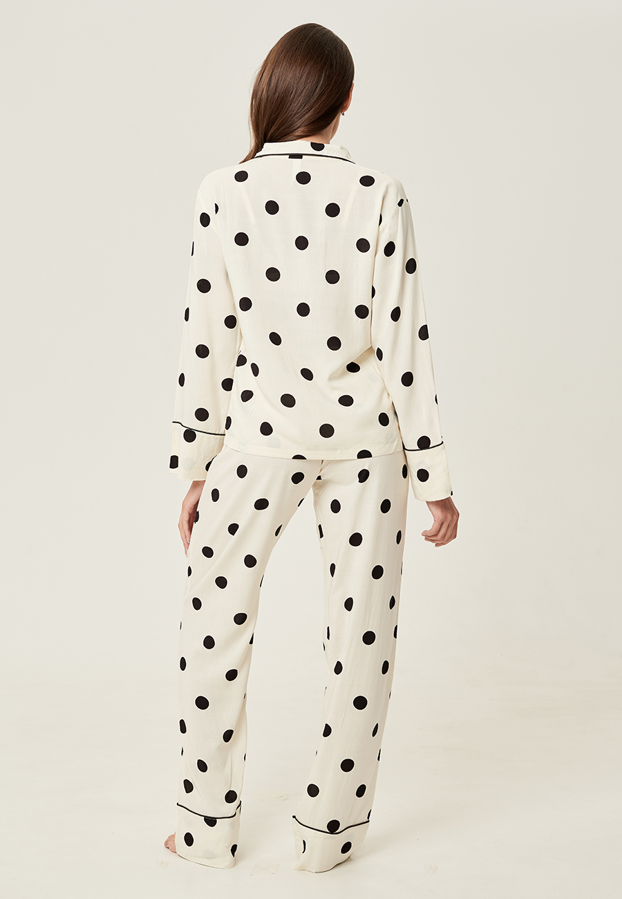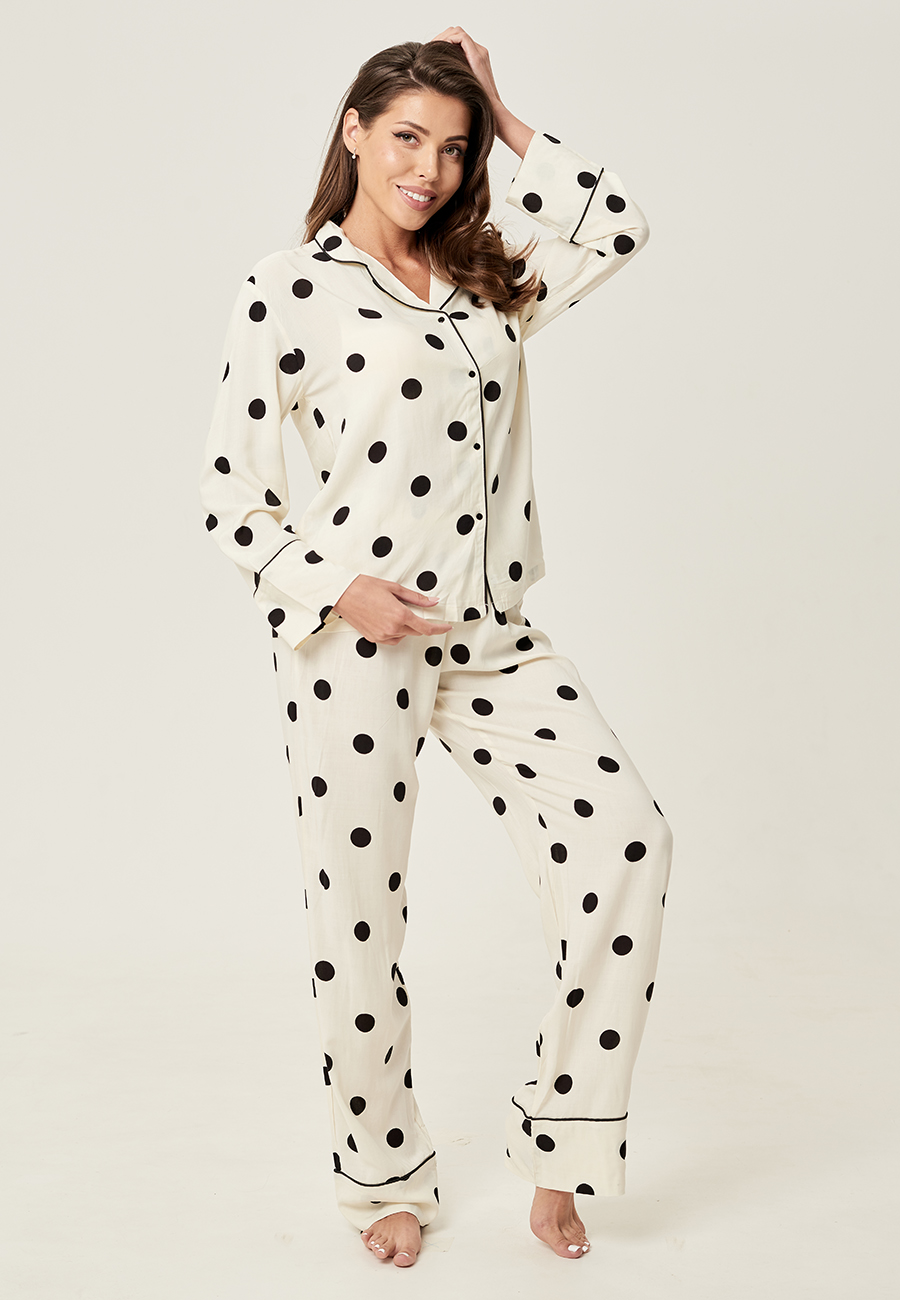 Игривый женский домашний комплект. Выполнен из мягкой летящей ткани с классическим принтом горошек. Комплект состоит из блузы и брюк. Блуза с лацканами застегивается на пуговицы спереди. Пояс свободных брюк дополнен эластичной лентой. Комфортное и женственное решение.