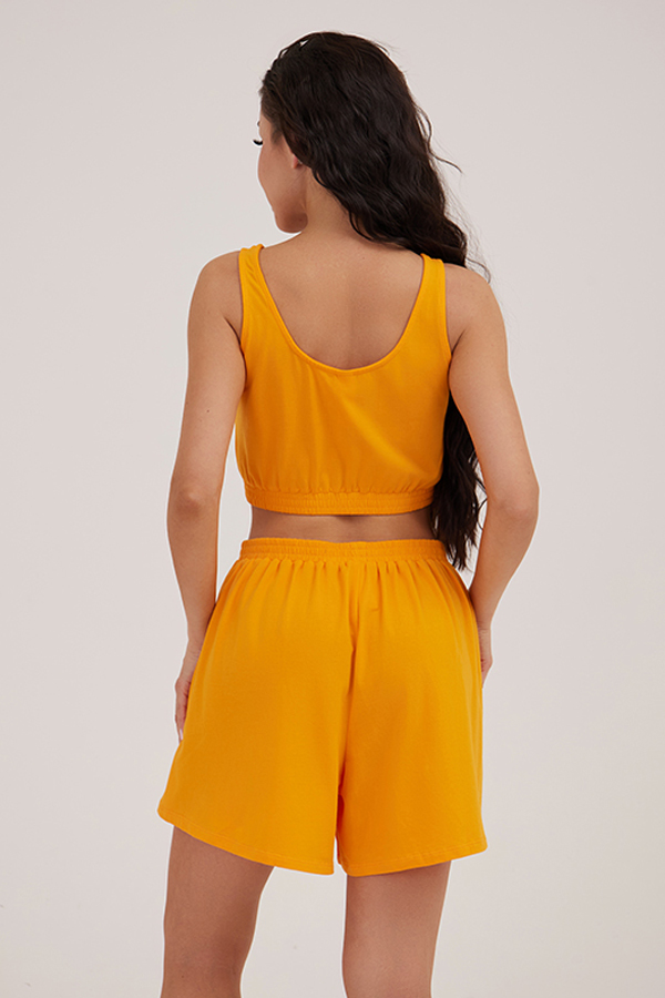 Пижама из трикотажного полотна насыщенного желтого цвета состоит из топа и шорт. Топ на широких бретелях с широкой резинкой. Спереди на резенке нашивка с наименованием бренда. Свободные шорты на широкой резинке с нашивкой с наименованием бренда.
