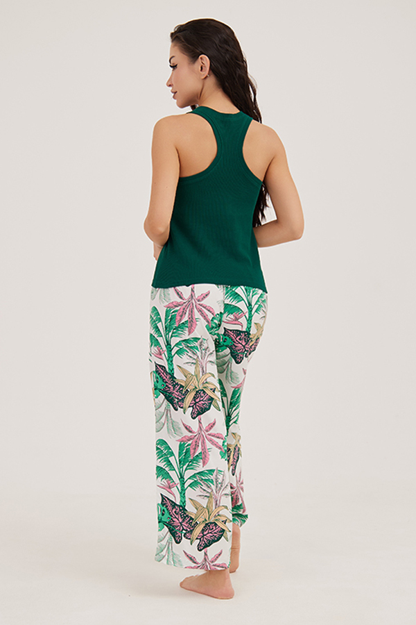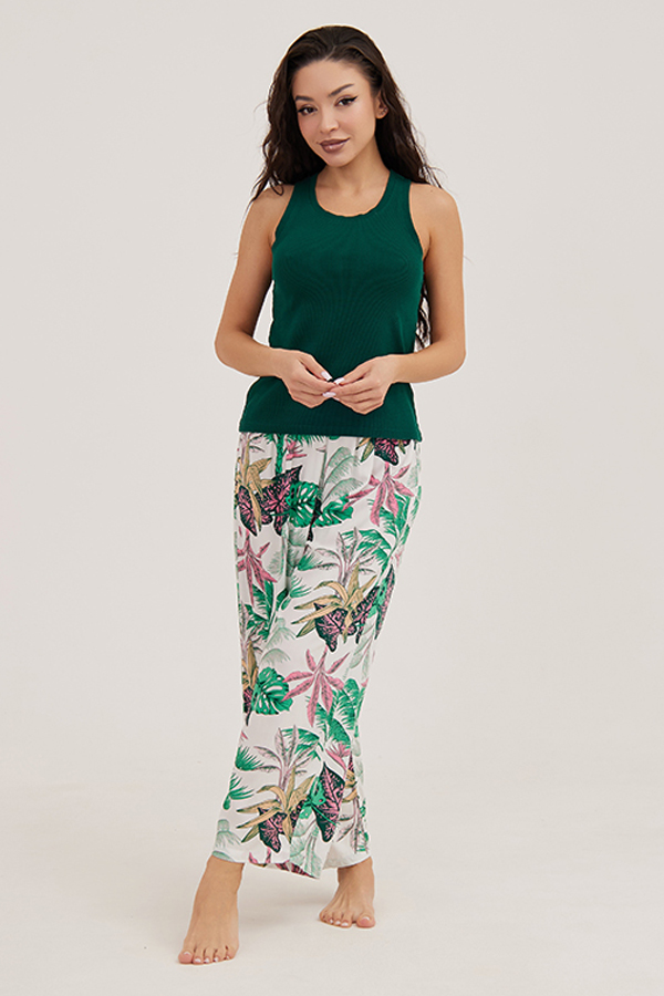 Домашний костюм состоит из майки зеленого цвета и принтованных брюк. Майка-боксерка выполнена из рибового трикотажного полотна. Брюки на трикотажной резинке и надписью Sensera выполнены из принтованной тканной вискозы.