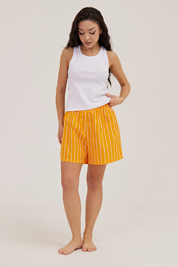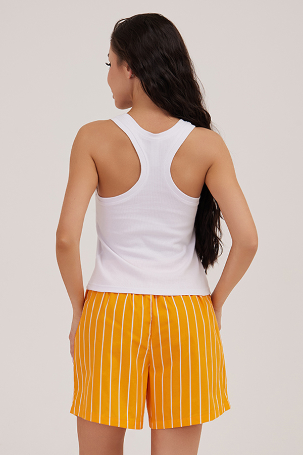 Домашний костюм состоит из майки, выполненной из трикотажного риба, и шорт, выполненных из поплина. Майка-боксерка белого цвета с широкими бретелями. Короткие шорты яркого желтого цвета в белую полоску, по талии широкая резинка.