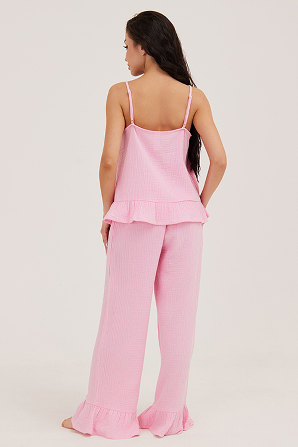 Пижама из жатого муслина (100% хлопок) нежно розового цвета выполнена из топа и брюк. Свободный топ на тонких регулируемых бретелях с воланом по низу изделия. Сободные брюки на резинке и воланами по низу брючин.