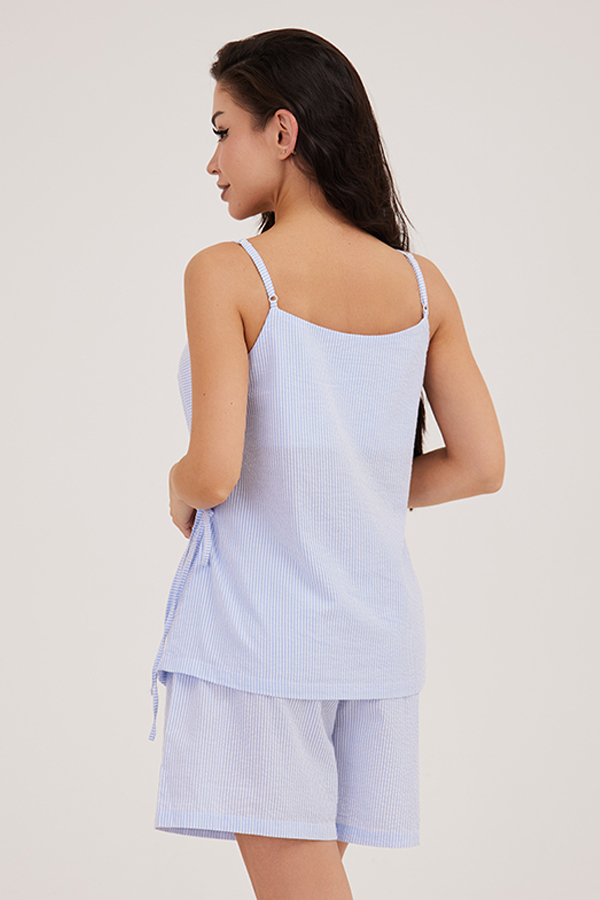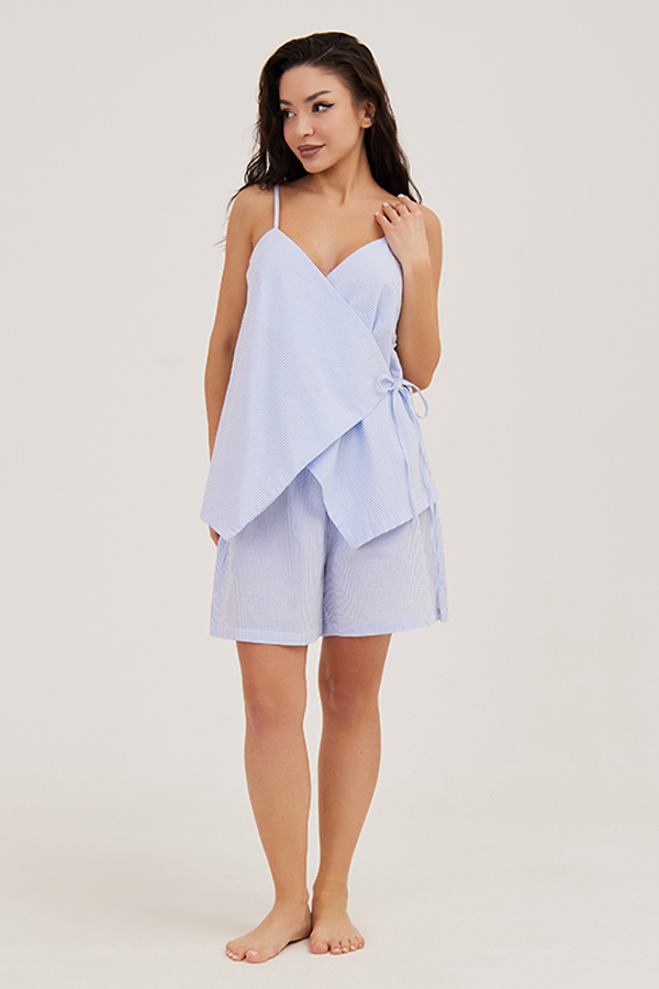 Пижама из жатого хлопка в бело-голубую полоску состоит из блузки и шорт. Блузка на тонких бретелях, полочки на запах с завязками по талии внутри и снаружи изделия. Свободные шорты с широкой резинкой.