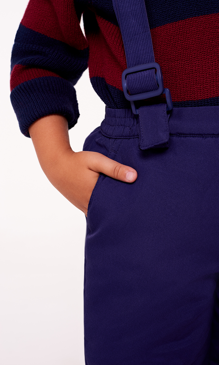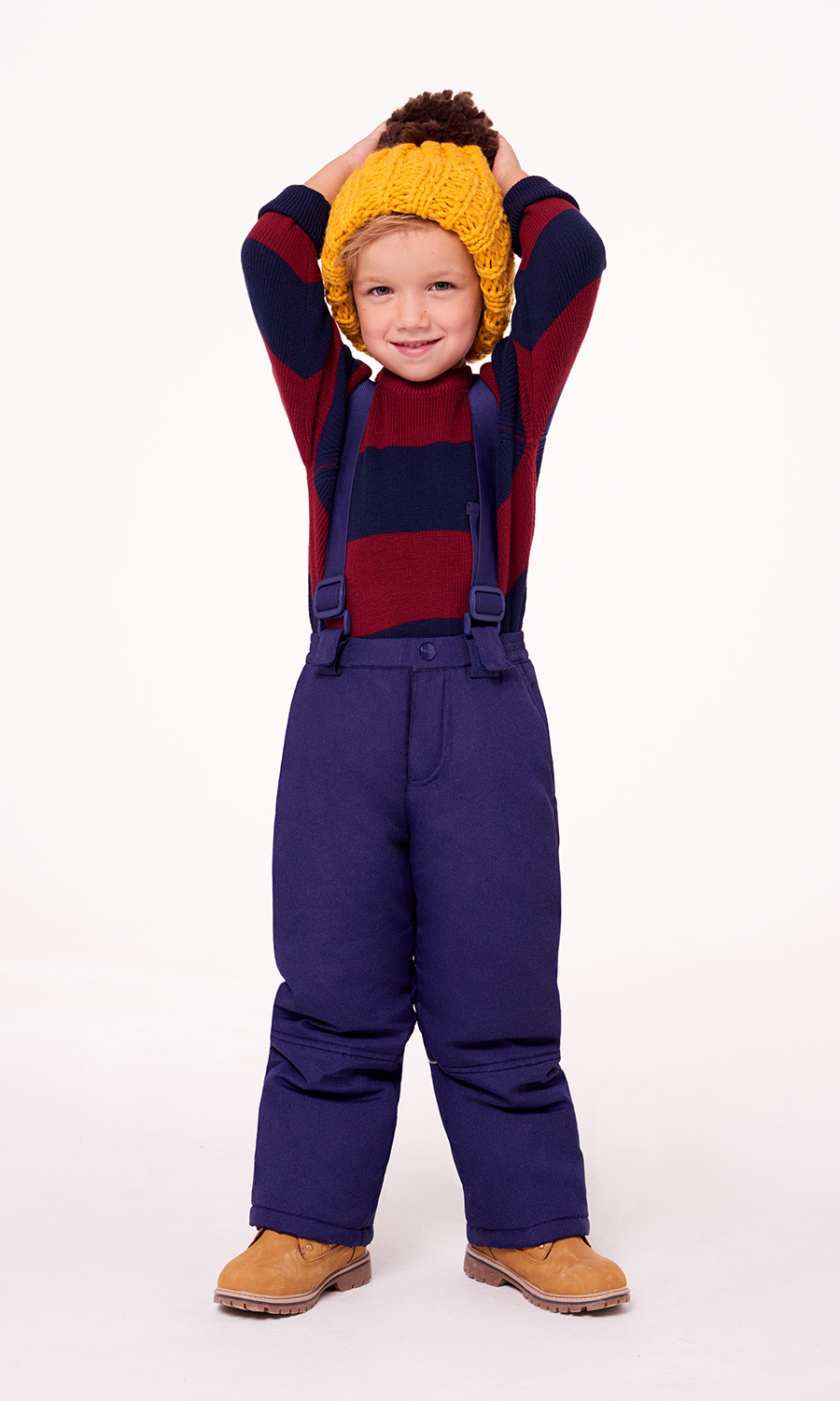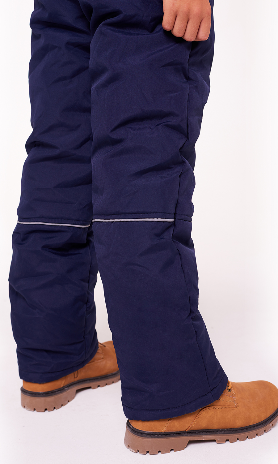 Утепленные брюки со съёмными подтяжками, манжетами на резинке, карманами по бокам и светоотражающими элементами на штанинах.