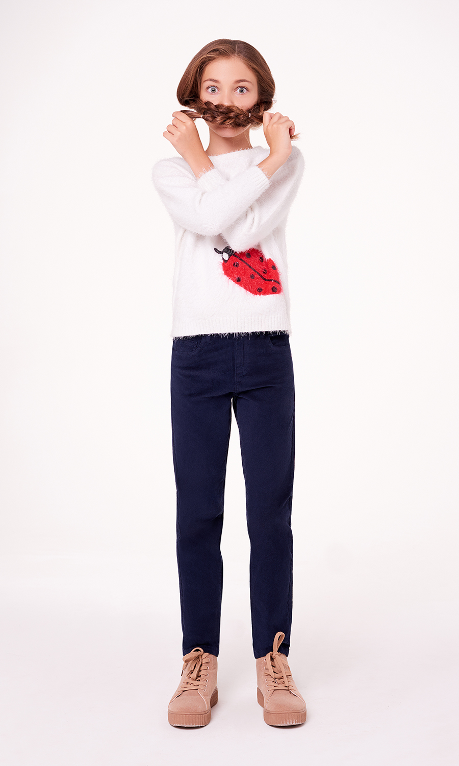 Брюки из микровельвета на подкладке, с карманами и застежкой на молнию и пуговицу.