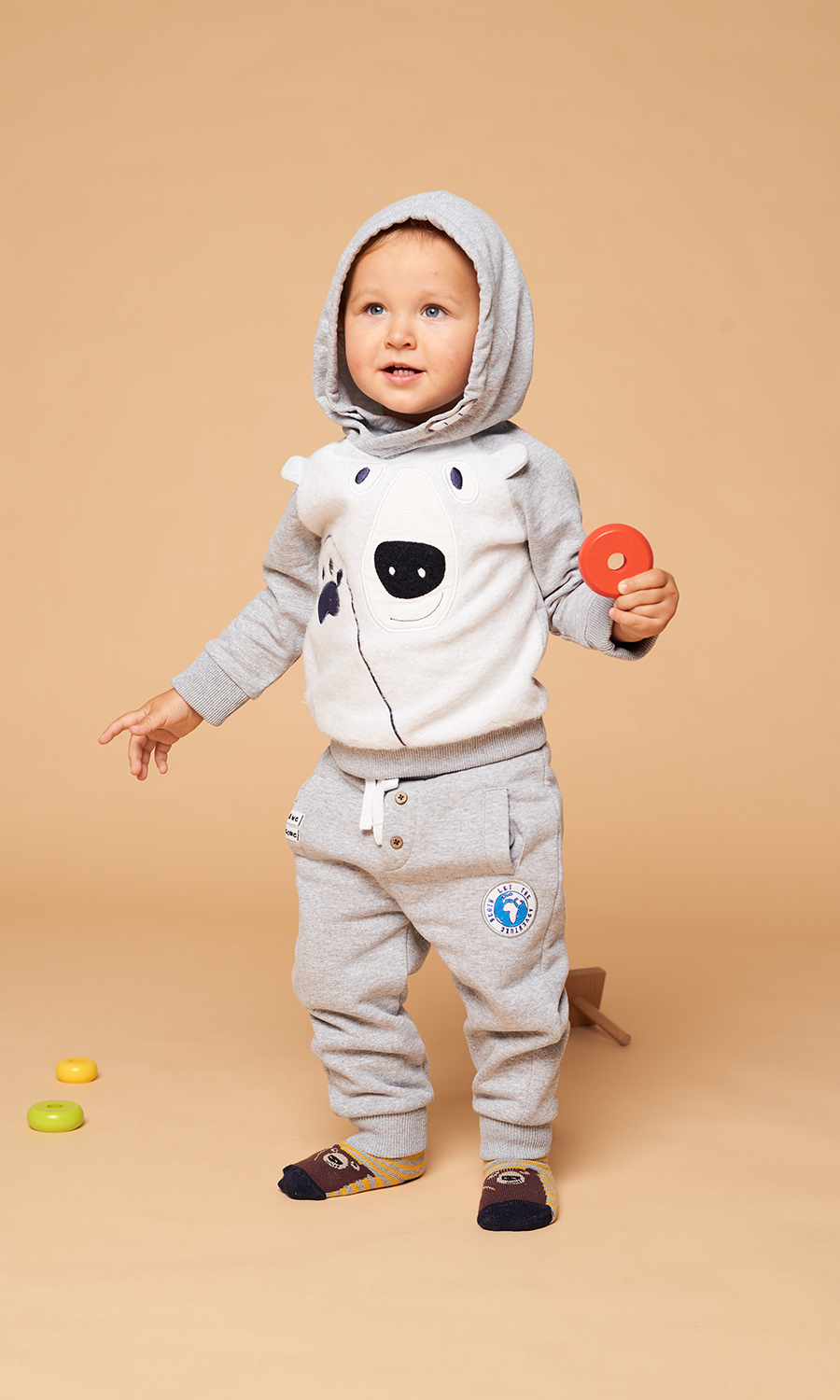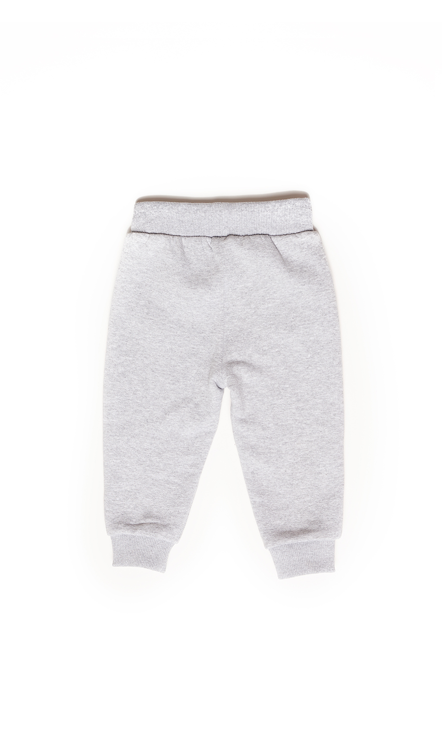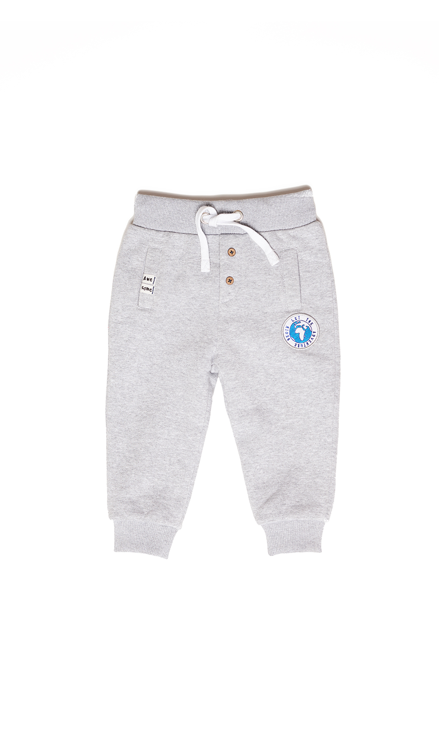 Серые трикотажные брюки из футера с начёсом: • Эластичные манжеты и пояс на регулируемом шнурке • Карманы по бокам • Нашивки • Имитация гульфика, декорированная пуговицами