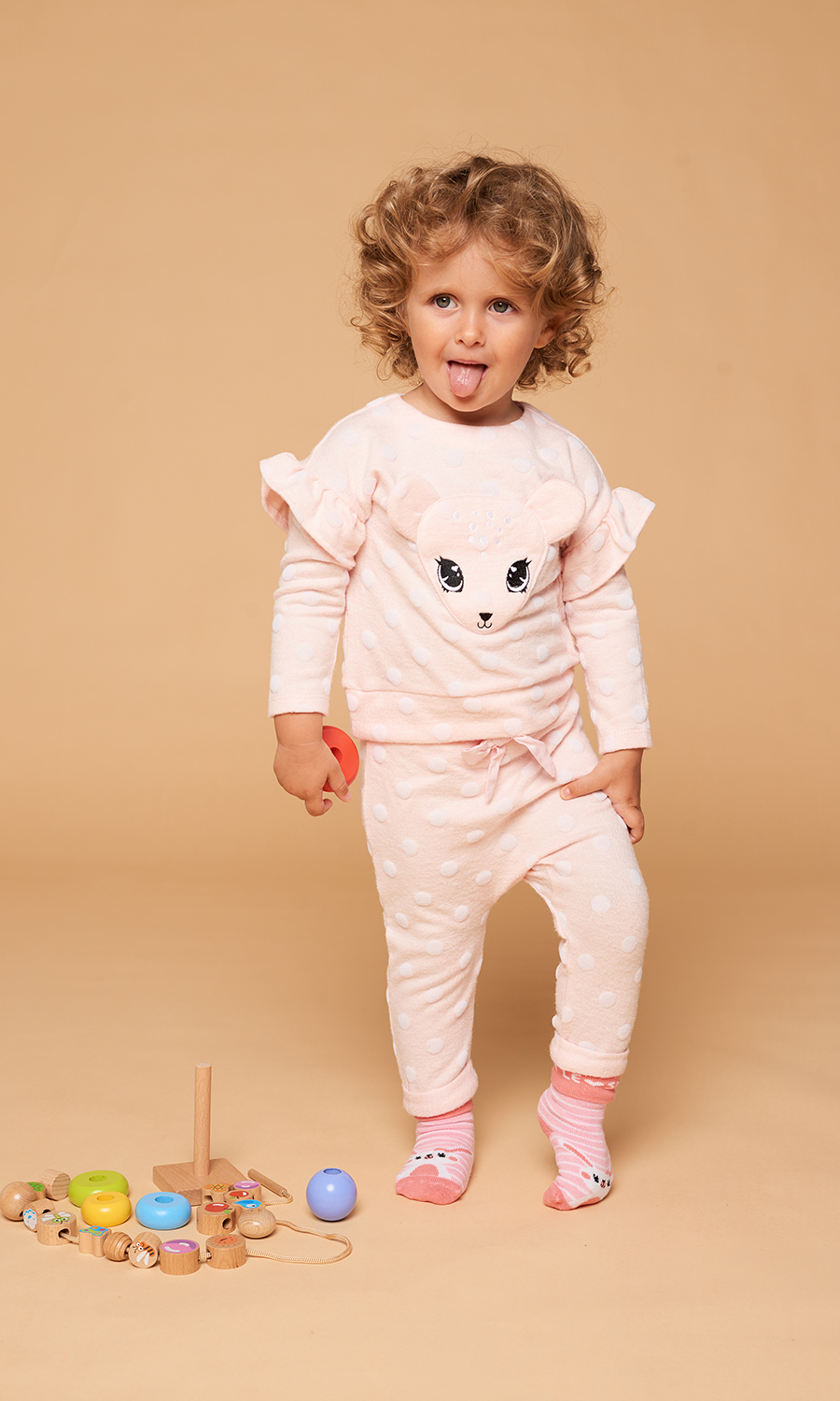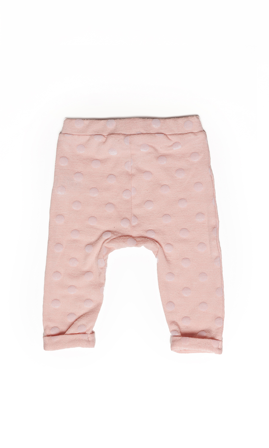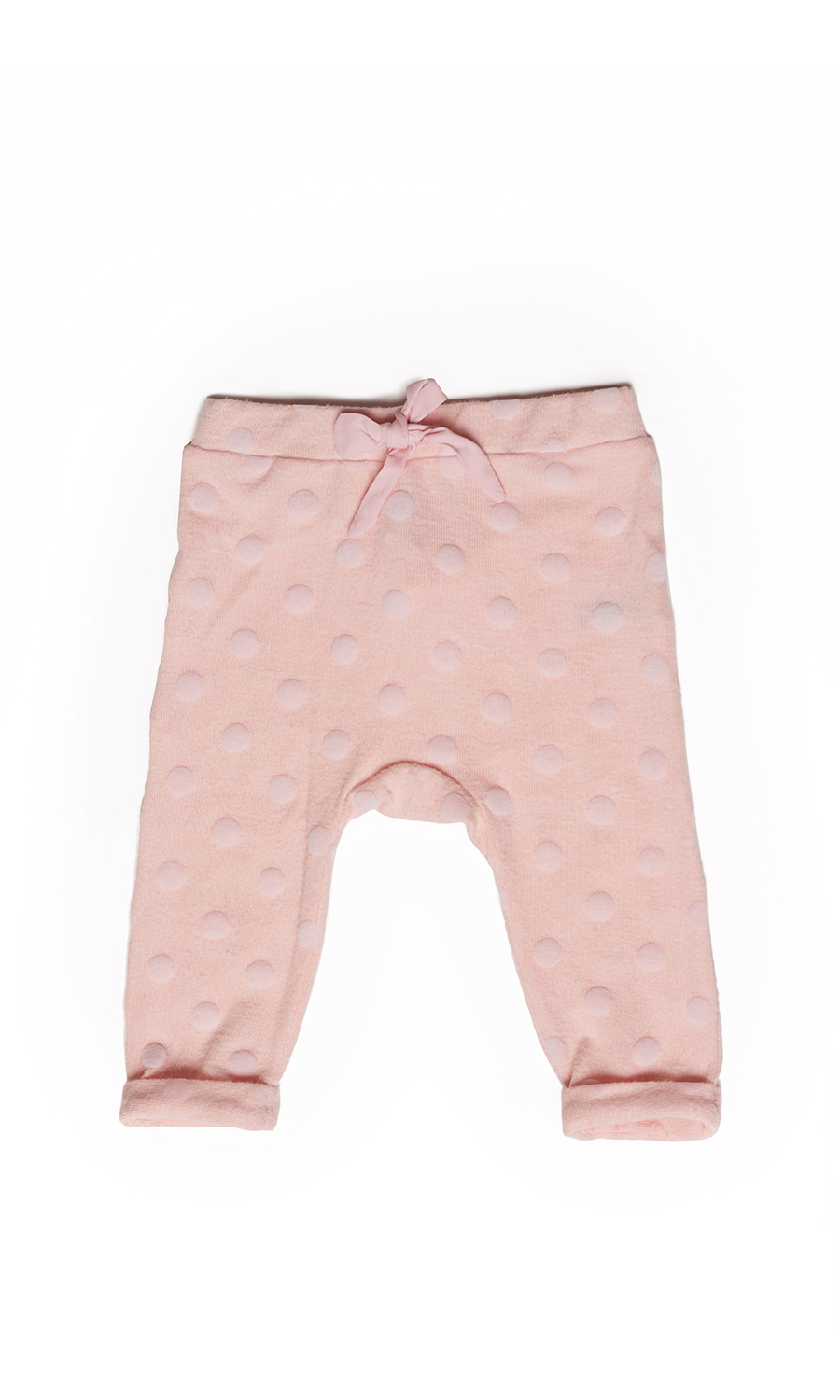Светло-розовые брюки из мягкого пушистого трикотажа: • Объёмный велюровый принт "горошек" по всему изделию • Эластичный пояс на декоративных завязках • Отвороты на манжетах