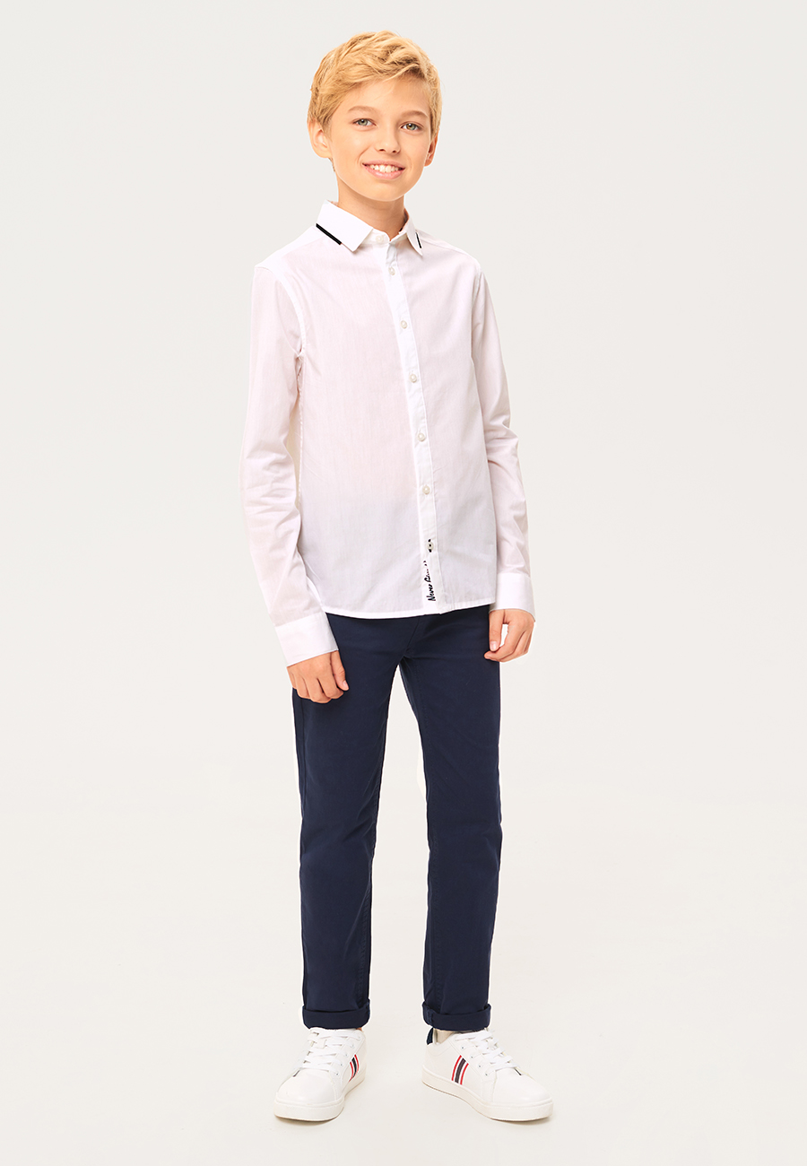 Оригинальная сорочка полуприлегающего силуэта для мальчика. Выполнена из приятного телу поплина. Длинные рукава с широкими манжетами. Отложной воротничок декорирован контрастным кантом. Спереди застежка на пуговицы на планке. Планка дополнена вышивкой с внутренней стороны. стильное и лаконичное решение для отличной учебы.