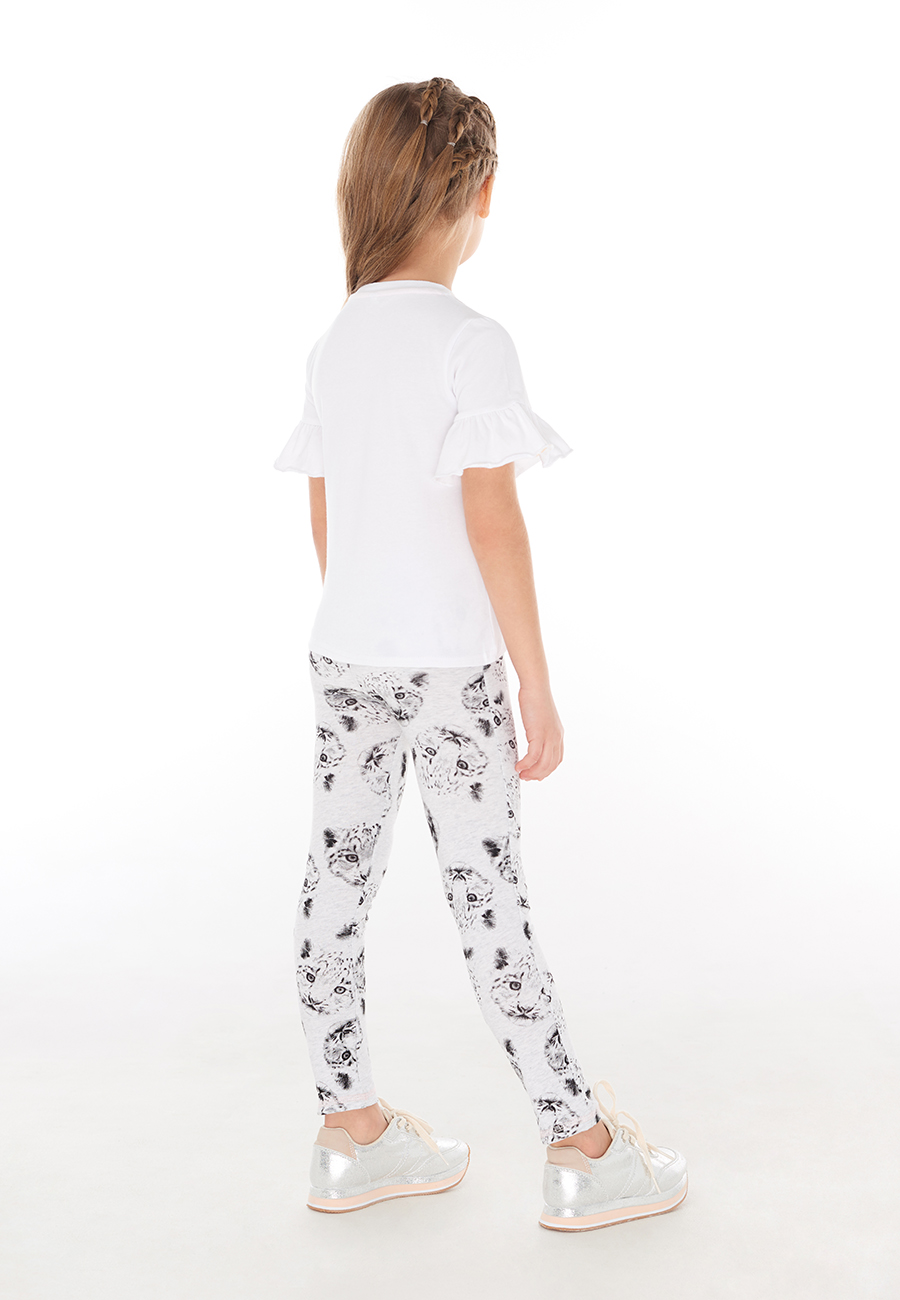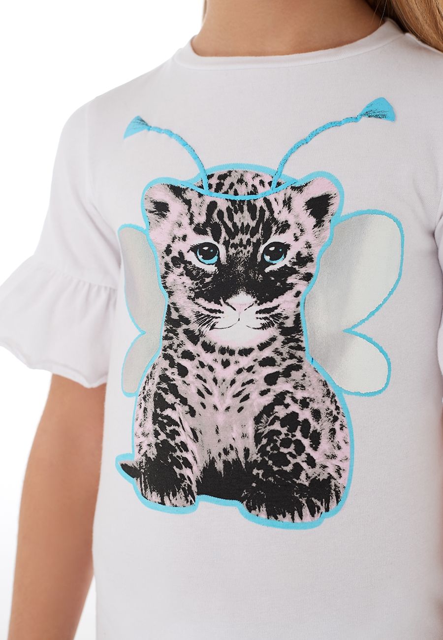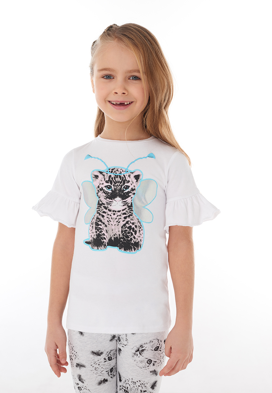 Детская футболка для маленьких девочек из джерси белого цвета. Модель с круглой горловиной и рукавом 3/4 с воланом по низу. Перед декорирован трендовым принтом с отражающим голографическим покрытием.