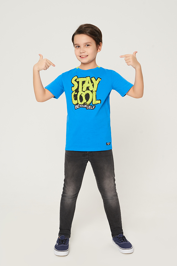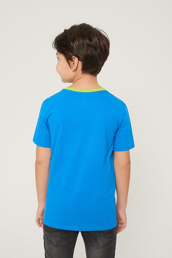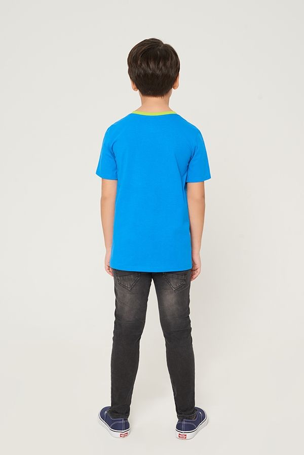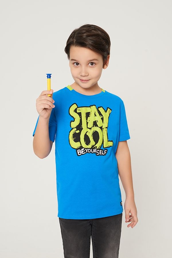 Детская трикотажная футболка с ярким объемным принтом для маленьких мальчиков. Изделие с круглой горловиной с контрастной вставкой, и коротким рукавом.