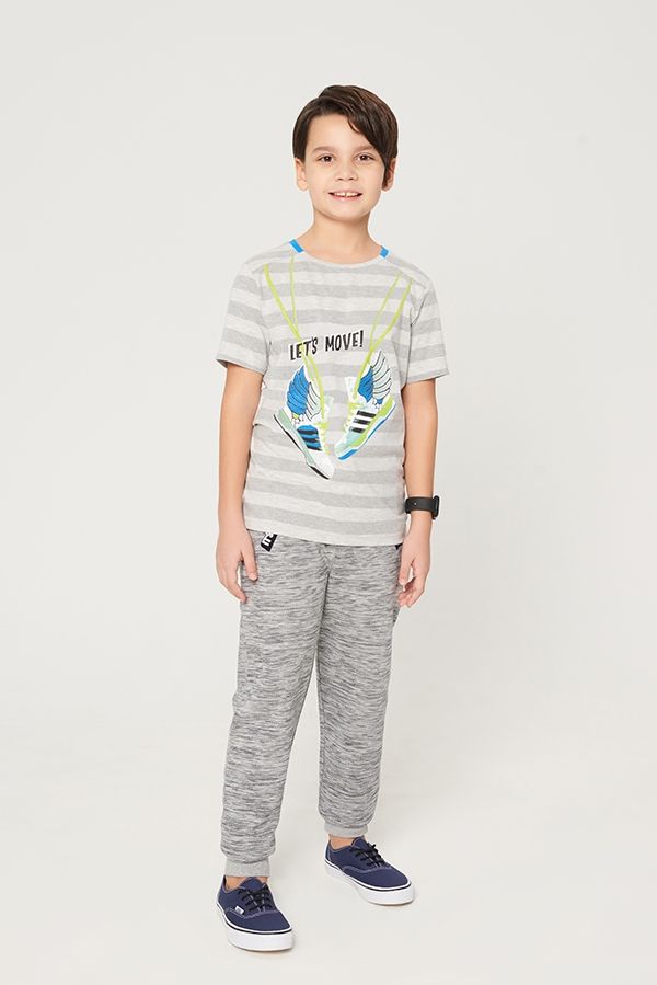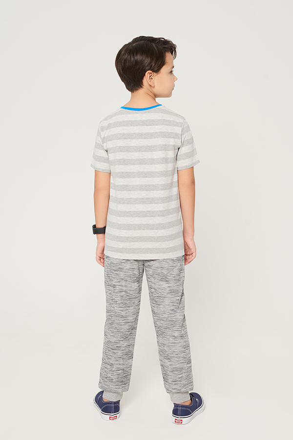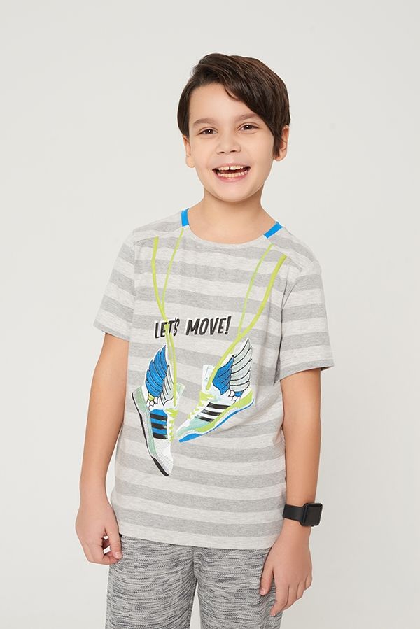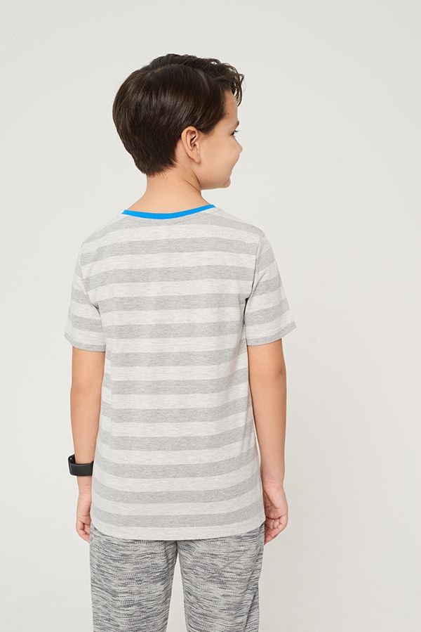 Детская трикотажная полосатая футболка с контрастным принтом на полочке для взрослых мальчиков. Изделие с круглой горловиной и коротким рукавом. Декоративный шов на плече.