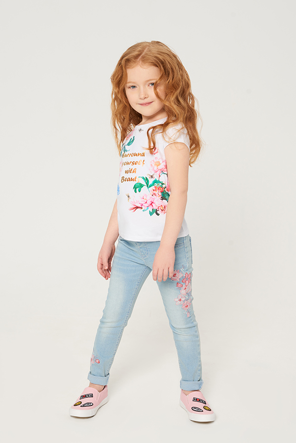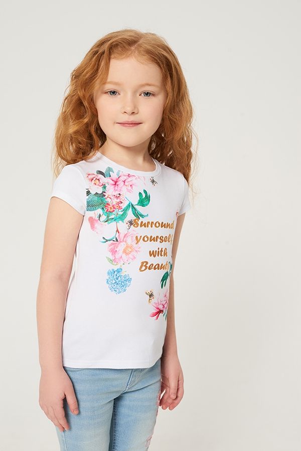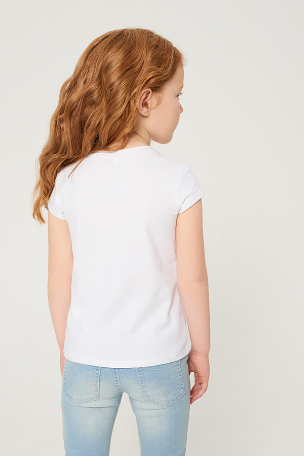 Детская трикотажная футболка белого цвета с контрастным принтом для маленьких девочек. Изделие с круглой горловиной и коротким рукавом.