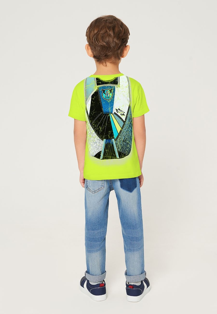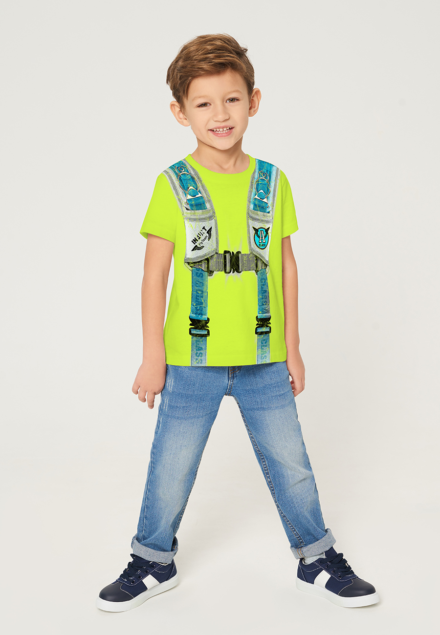 Детская трикотажная футболка ярко-зелёного цвета с контрастным принтом на полочке и спинке для маленьких мальчиков. Изделие с круглой контрастной горловиной, и коротким рукавом с подворотом по низу.