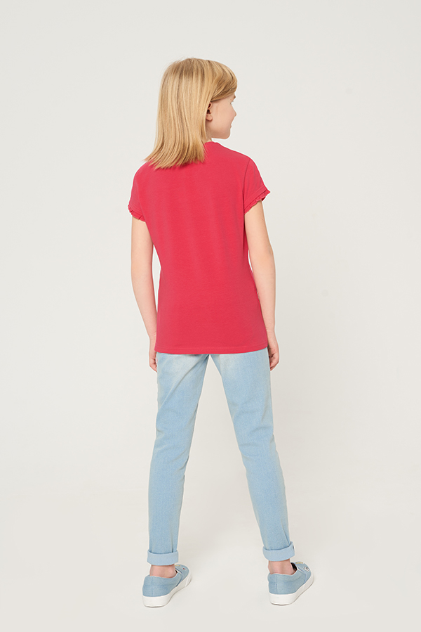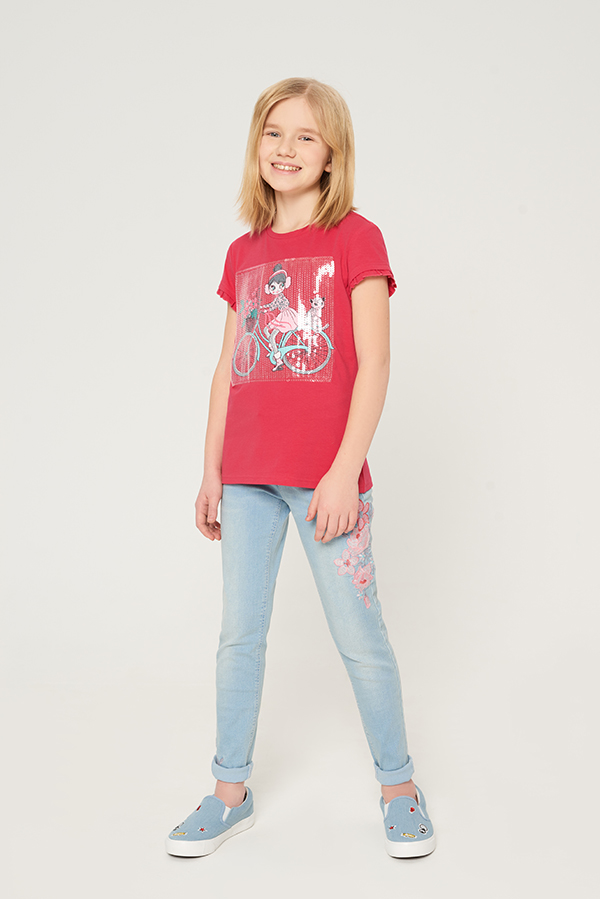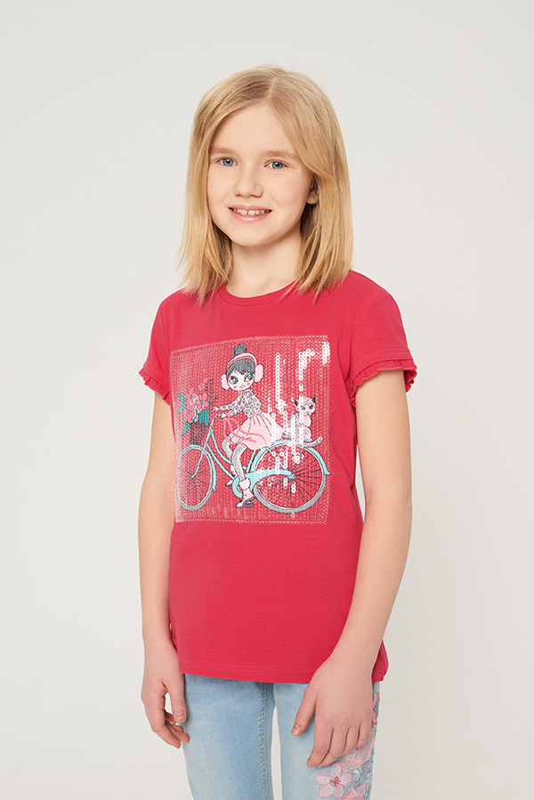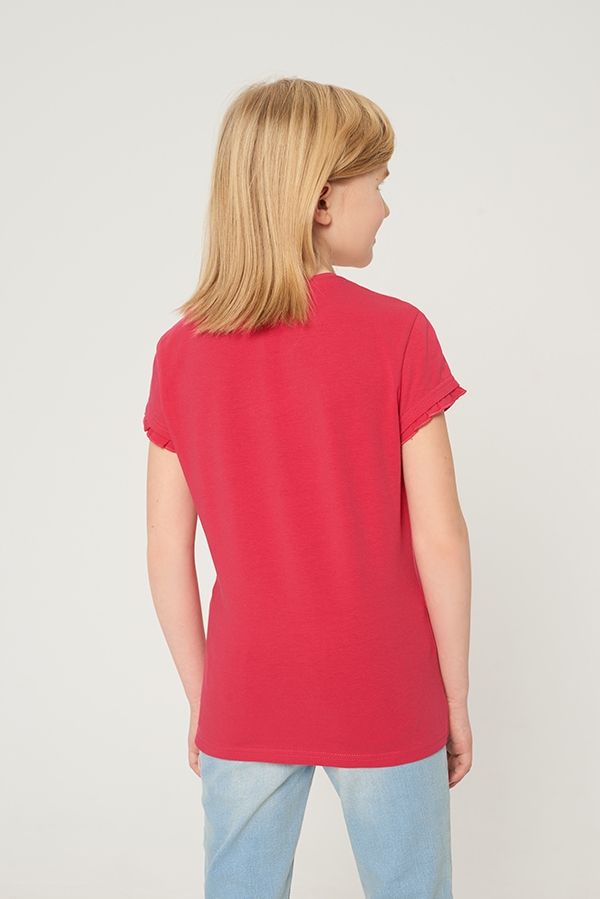 Детская трикотажная футболка розового цвета с контрастным принтом из пайеток для взрослых девочек. Изделие с круглой горловиной и коротким рукавом с рюшей.