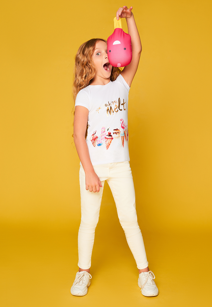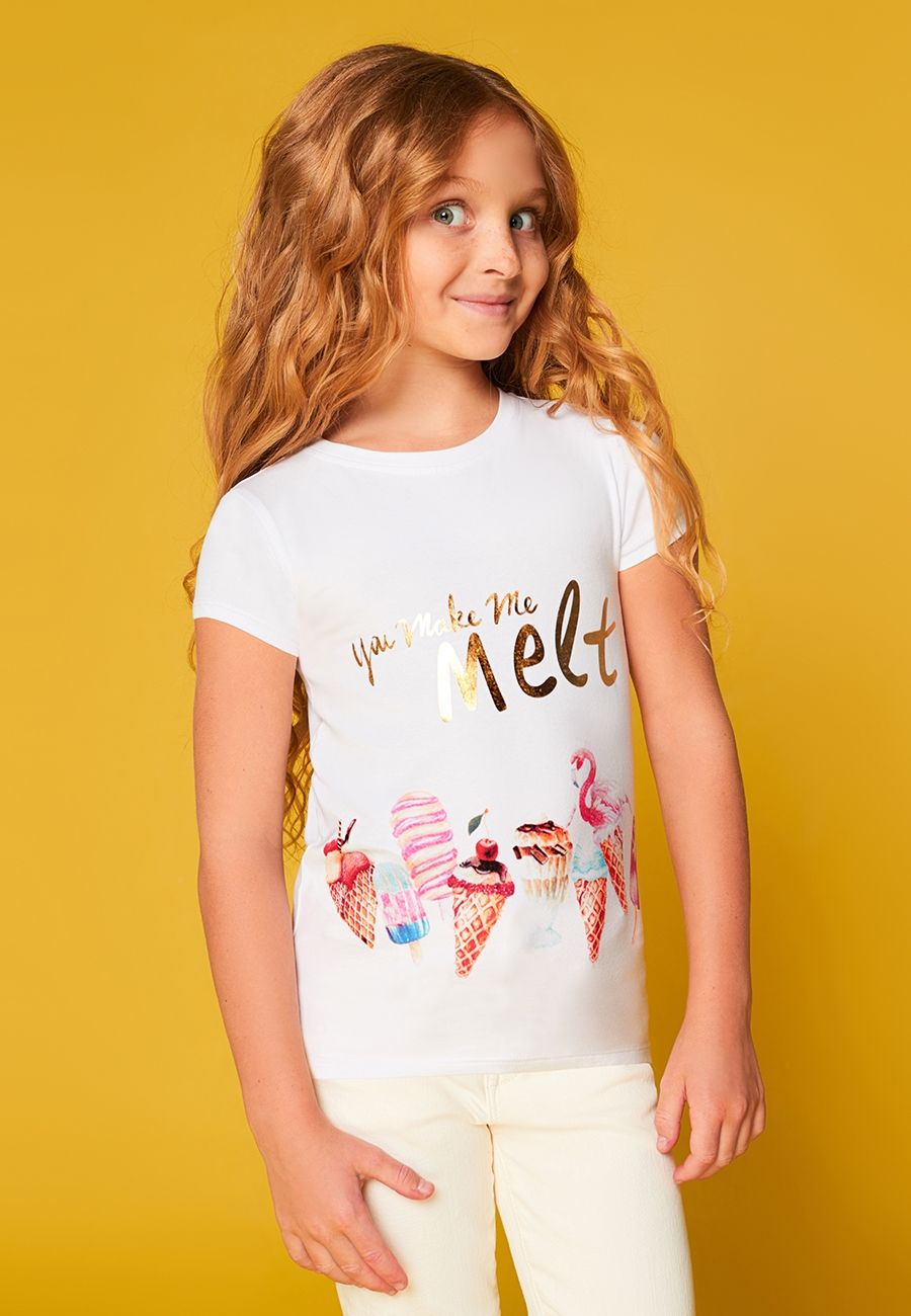 Футболка детская для девочек, украшена ярким принтом спереди. Нарядный образ для маленькой модницы.