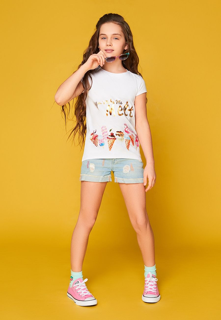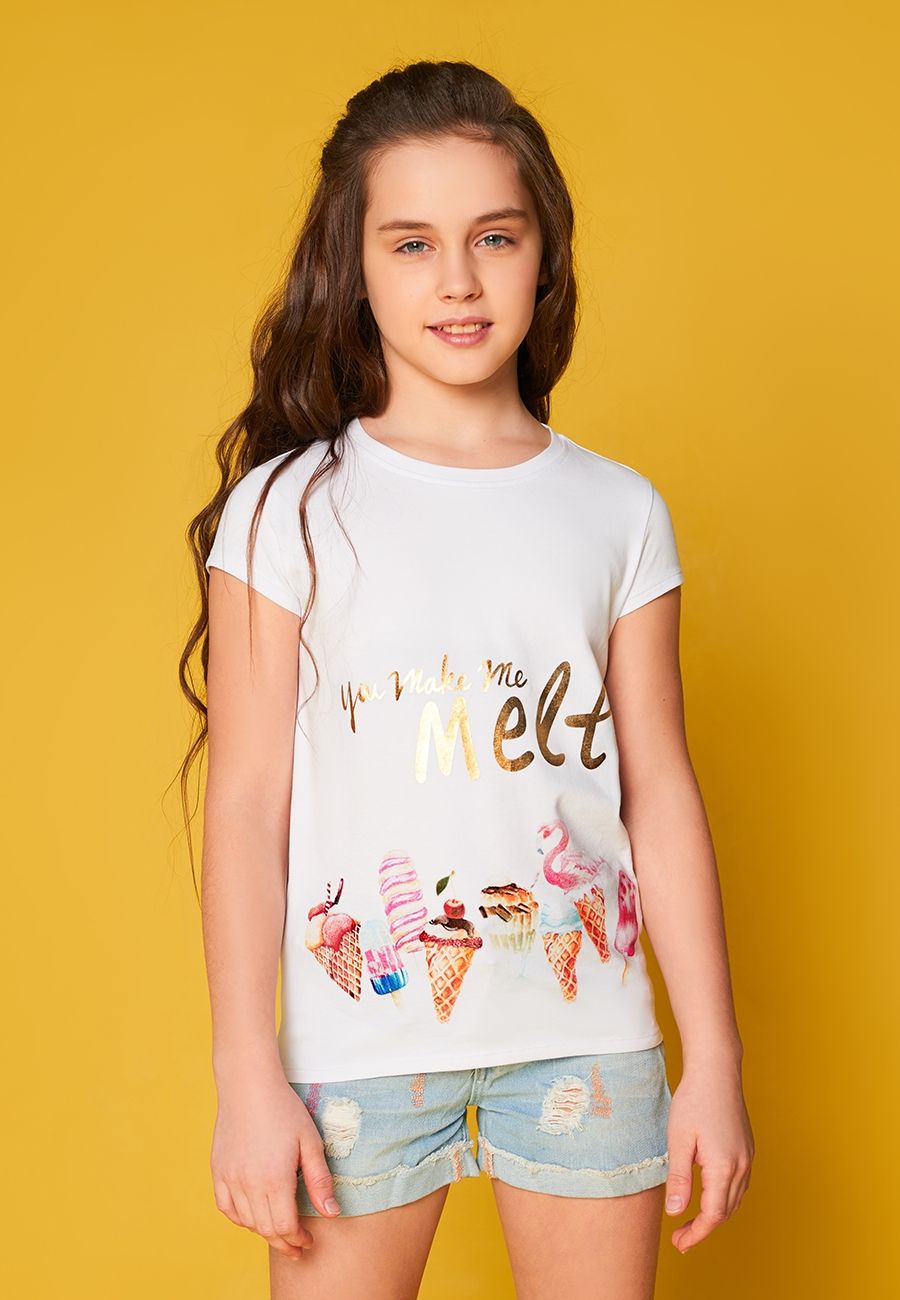 Футболка детская для девочек, украшена ярким принтом спереди. Нарядный образ для юной модницы.