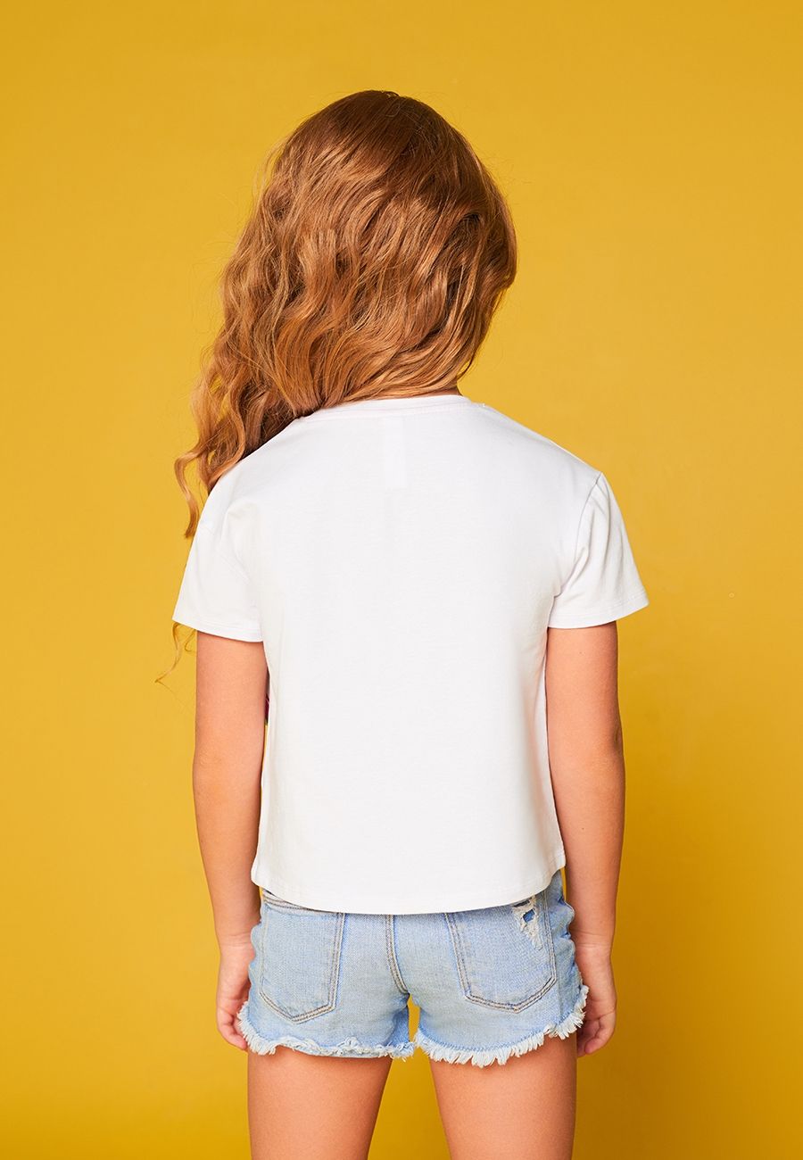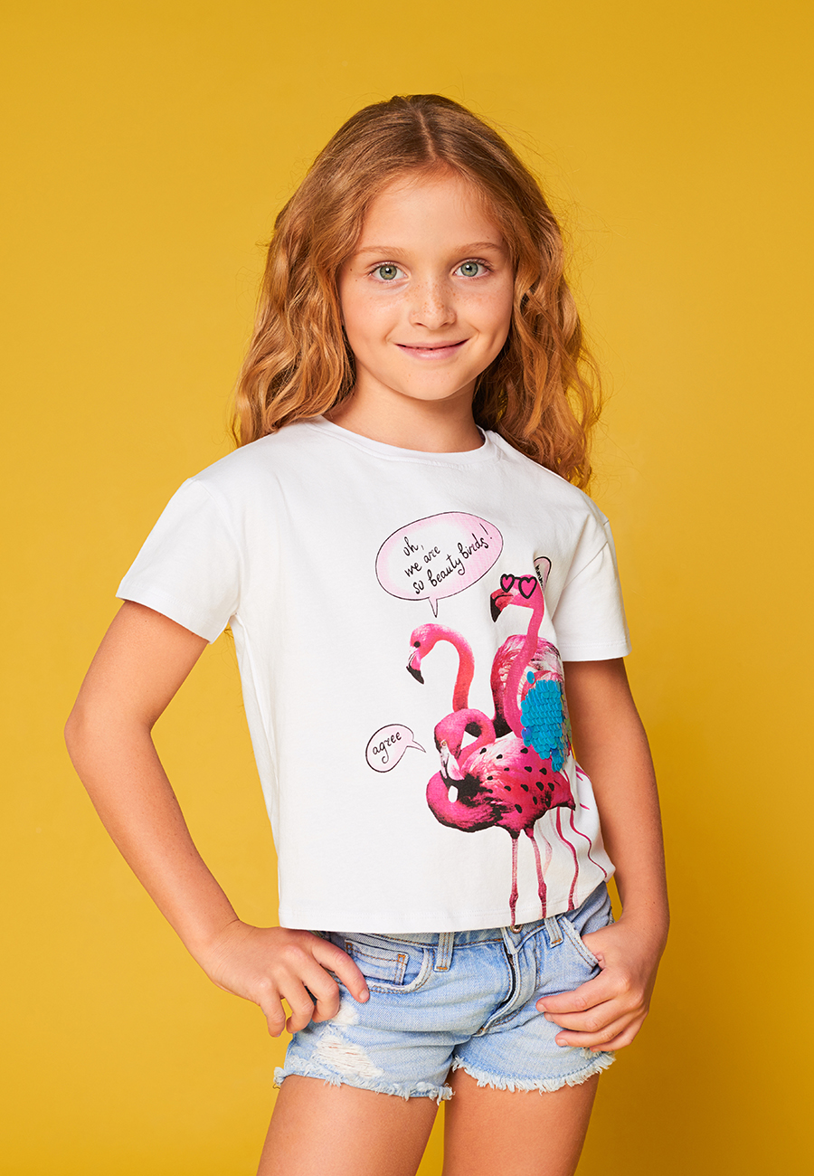 Футболка белая с ярким принтом и накладными деталями спереди. Отличный вариант для летних прогулок!