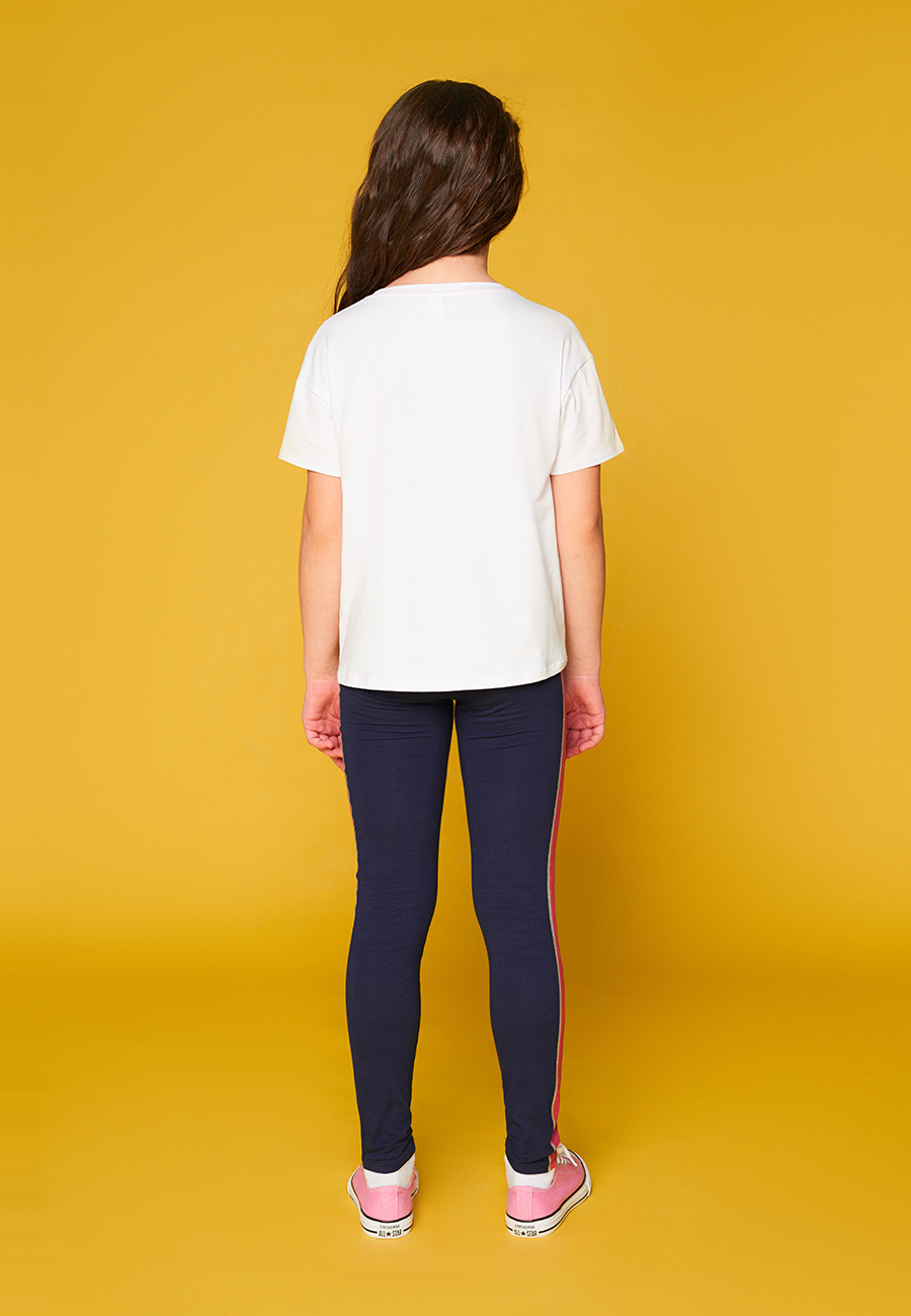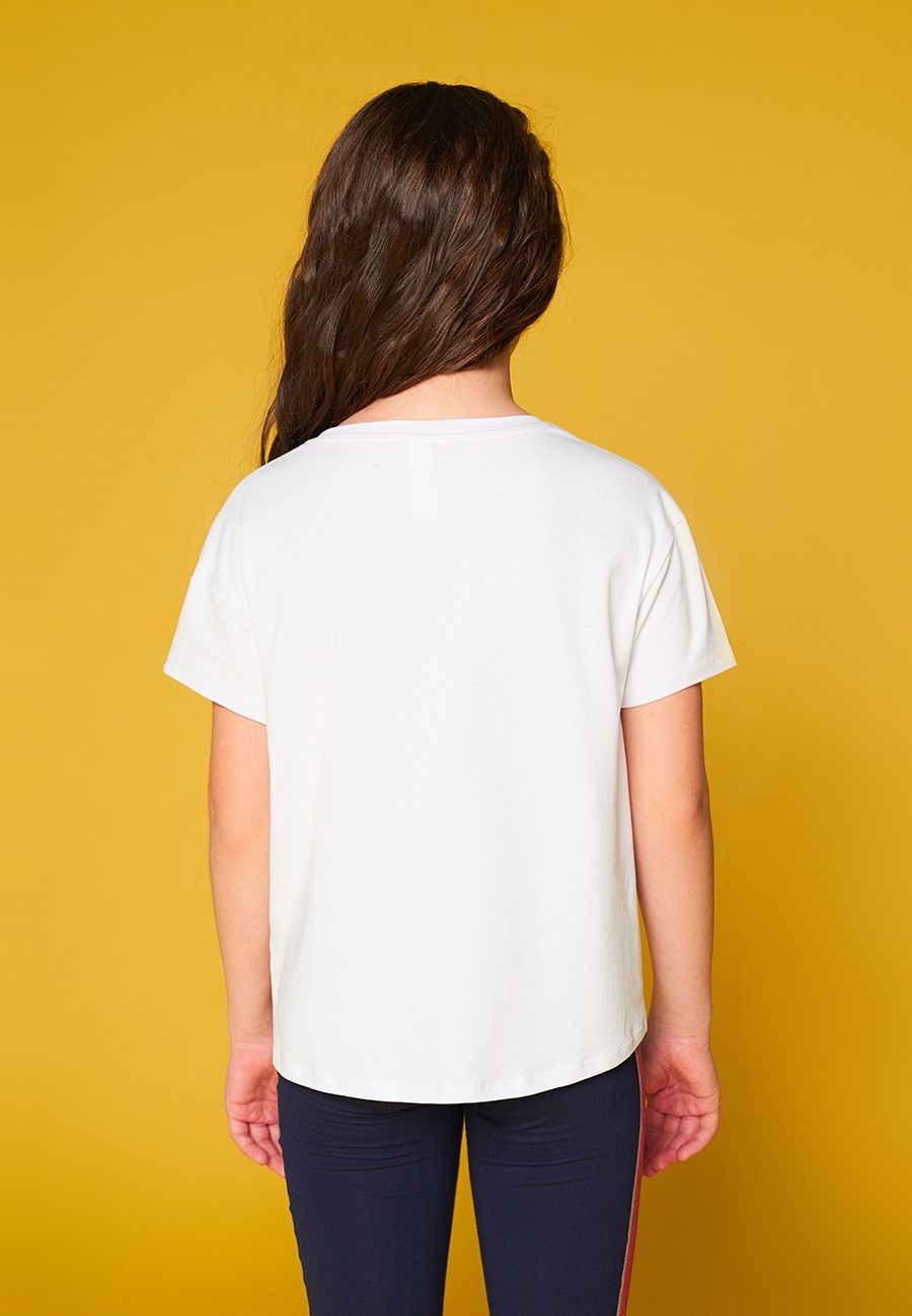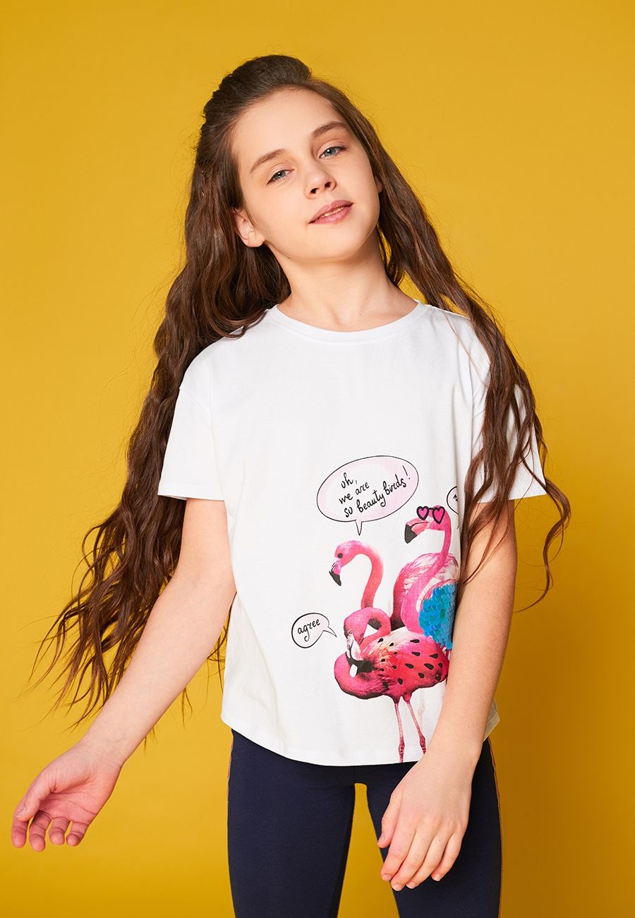 Футболка белая с ярким принтом и накладными деталями спереди. Отличный вариант для летних прогулок!