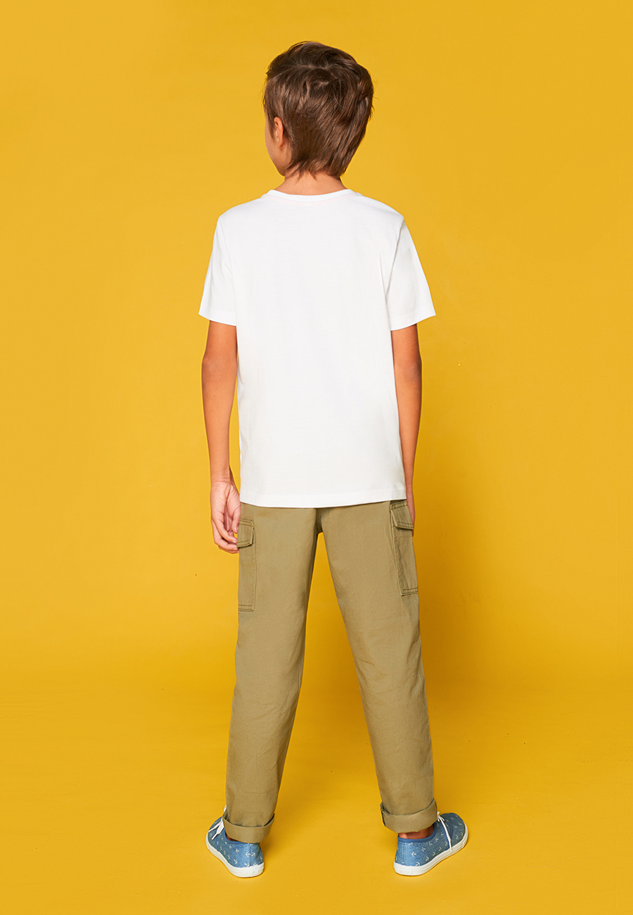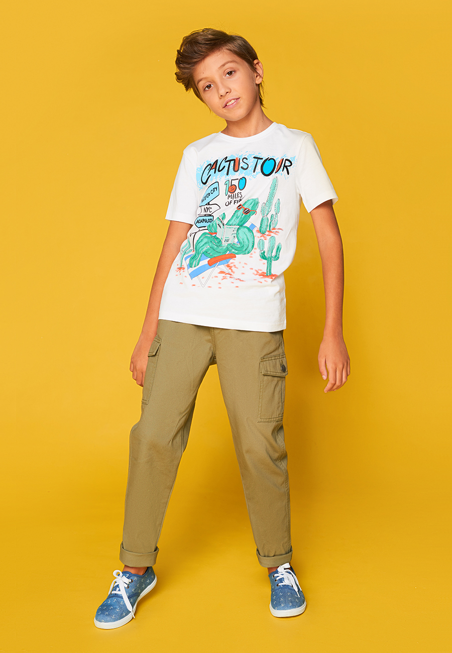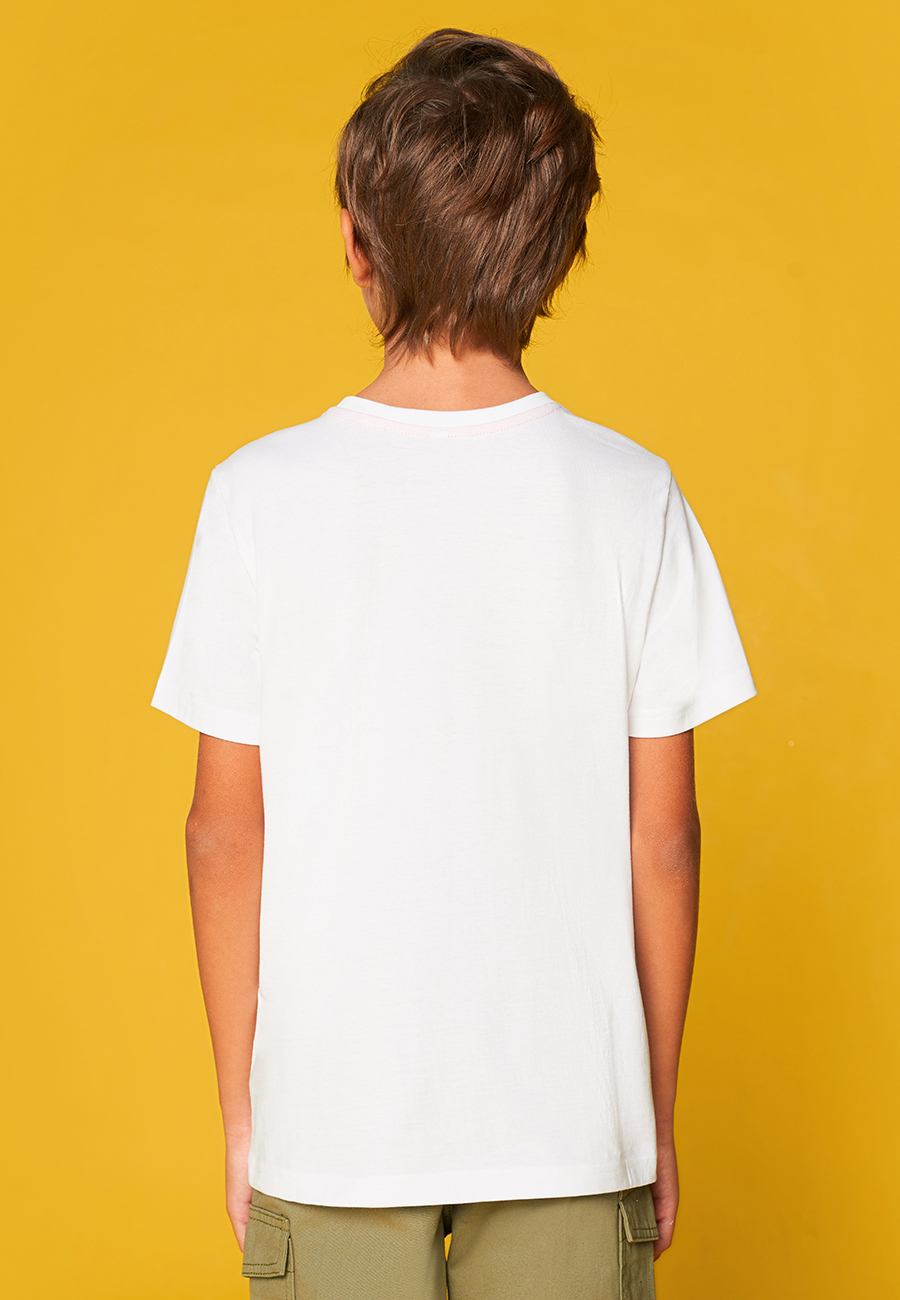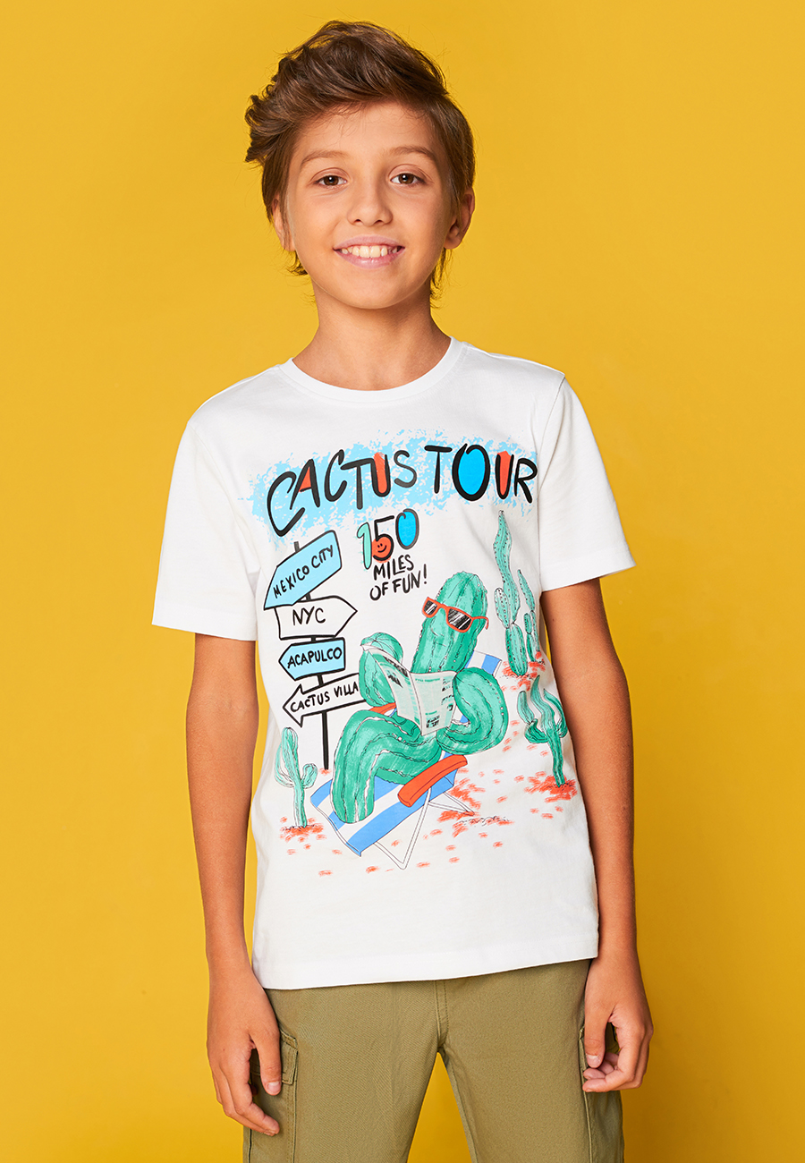 Футболка для мальчика с коротким рукавом и круглой горловиной. На передней части изделия принт.
