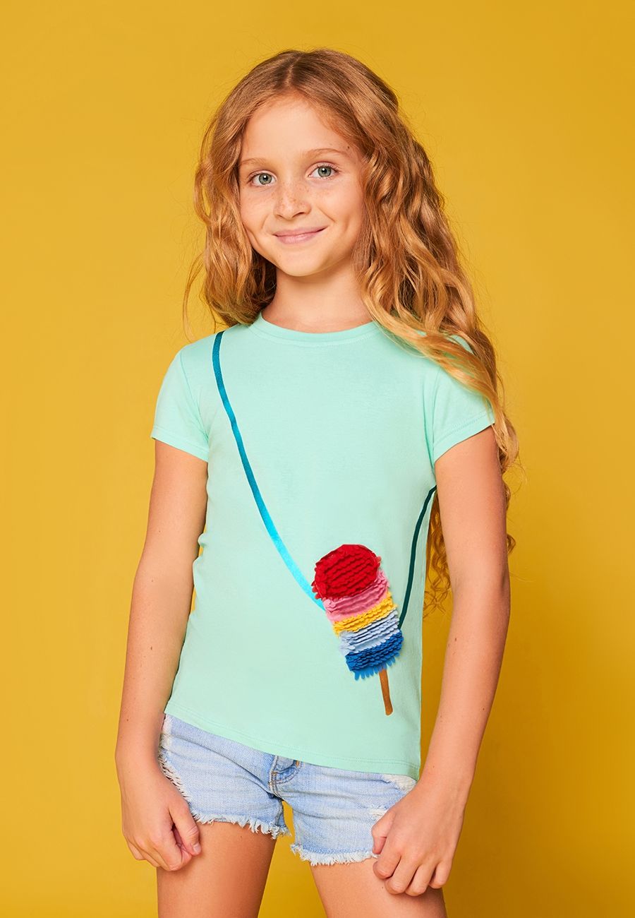 Футболка детская для девочек голубая, украшена принтом спереди.
