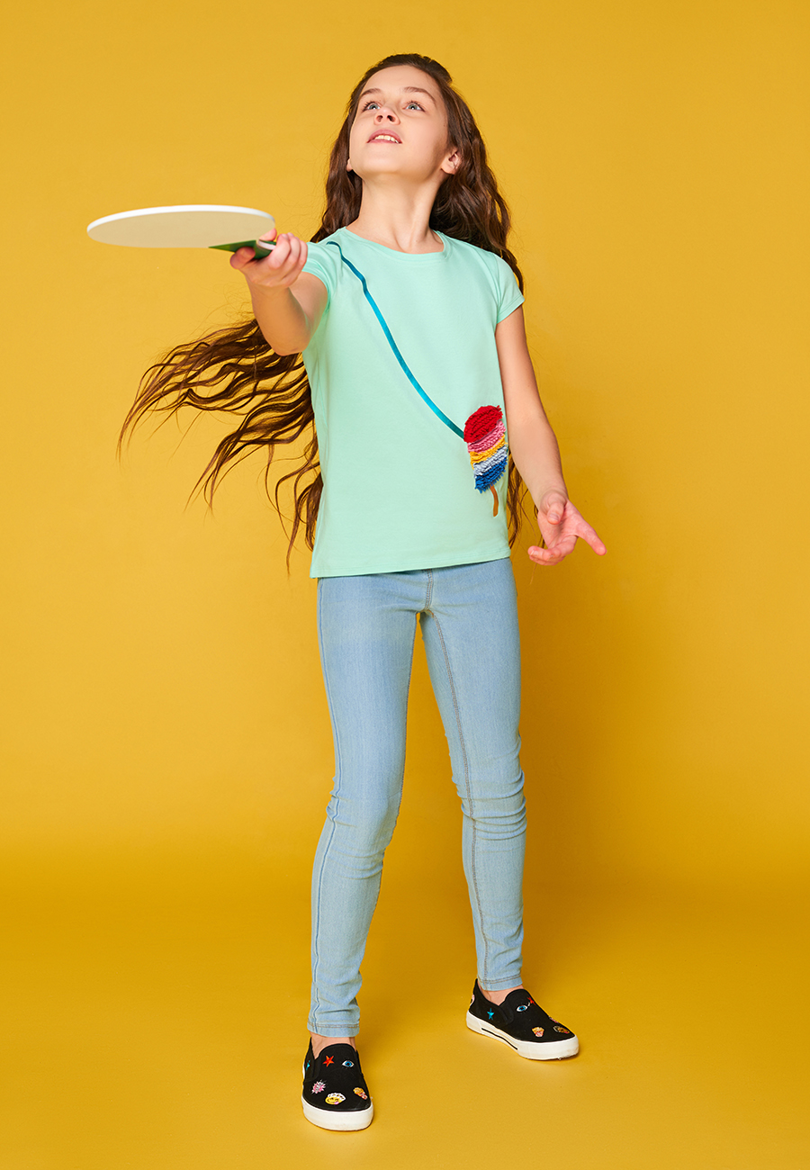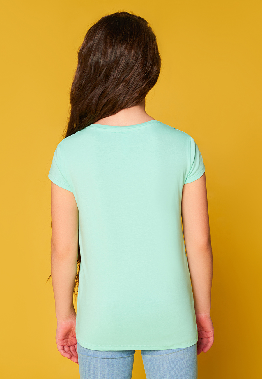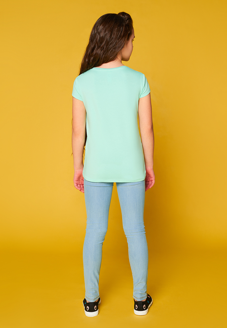 Футболка детская для девочек голубая, украшена принтом спереди.