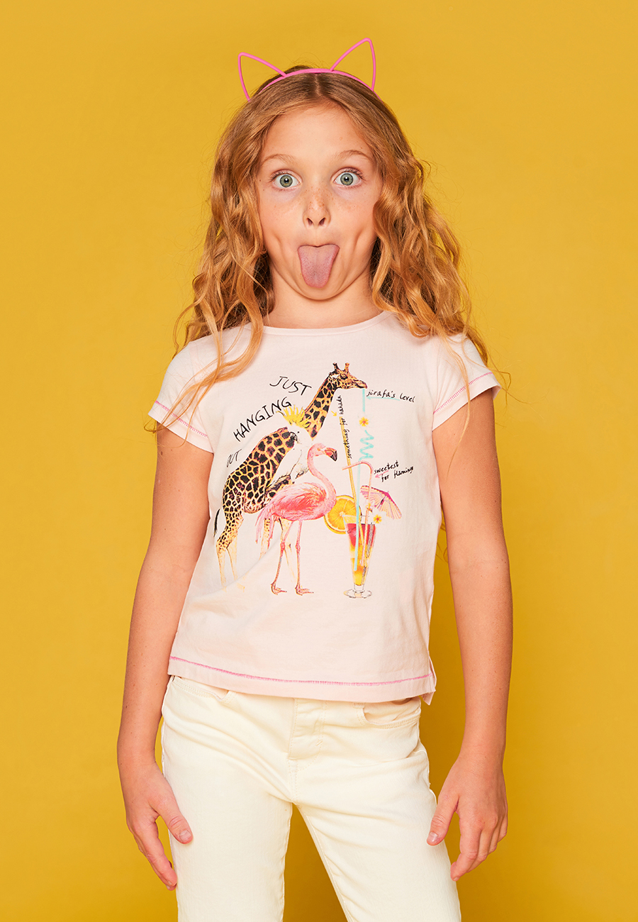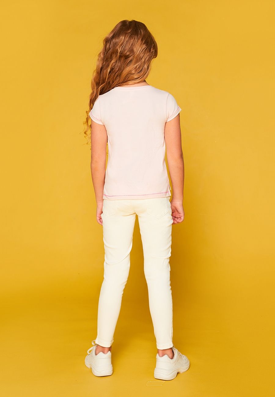 Розовая футболка, украшена тесьмой с люрексом по горловине на спинке и ярким принтом спереди.