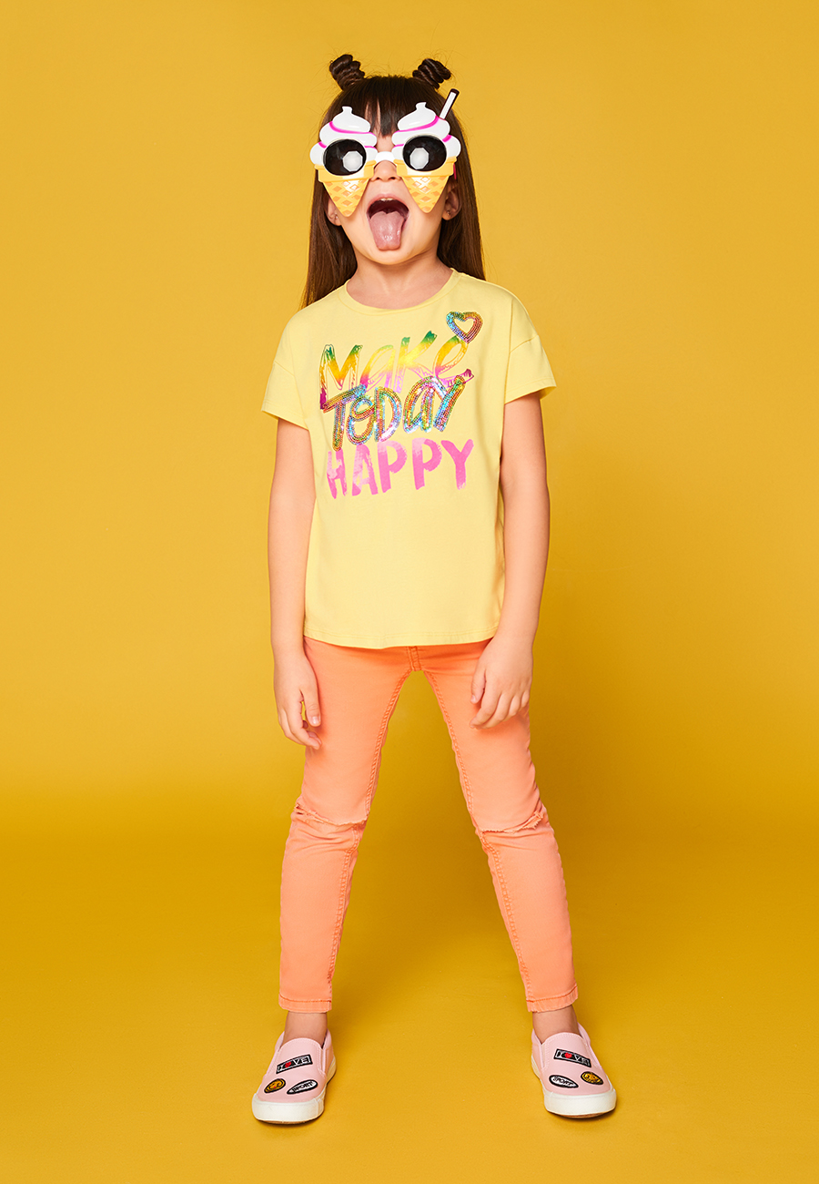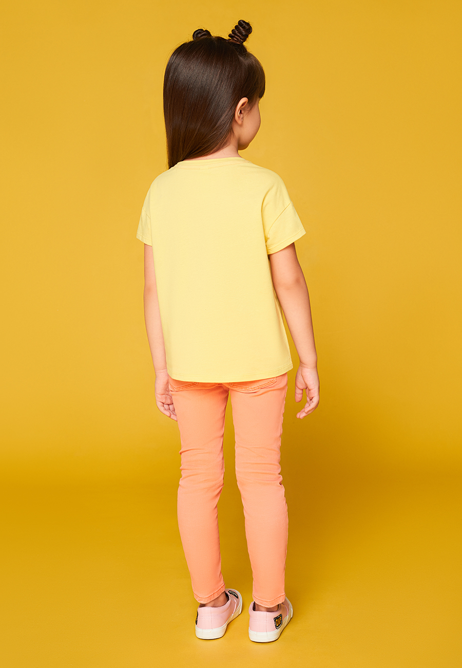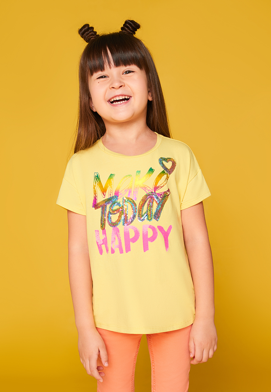Футболка детская для девочек желтая, украшена принтом с блёстками спереди.