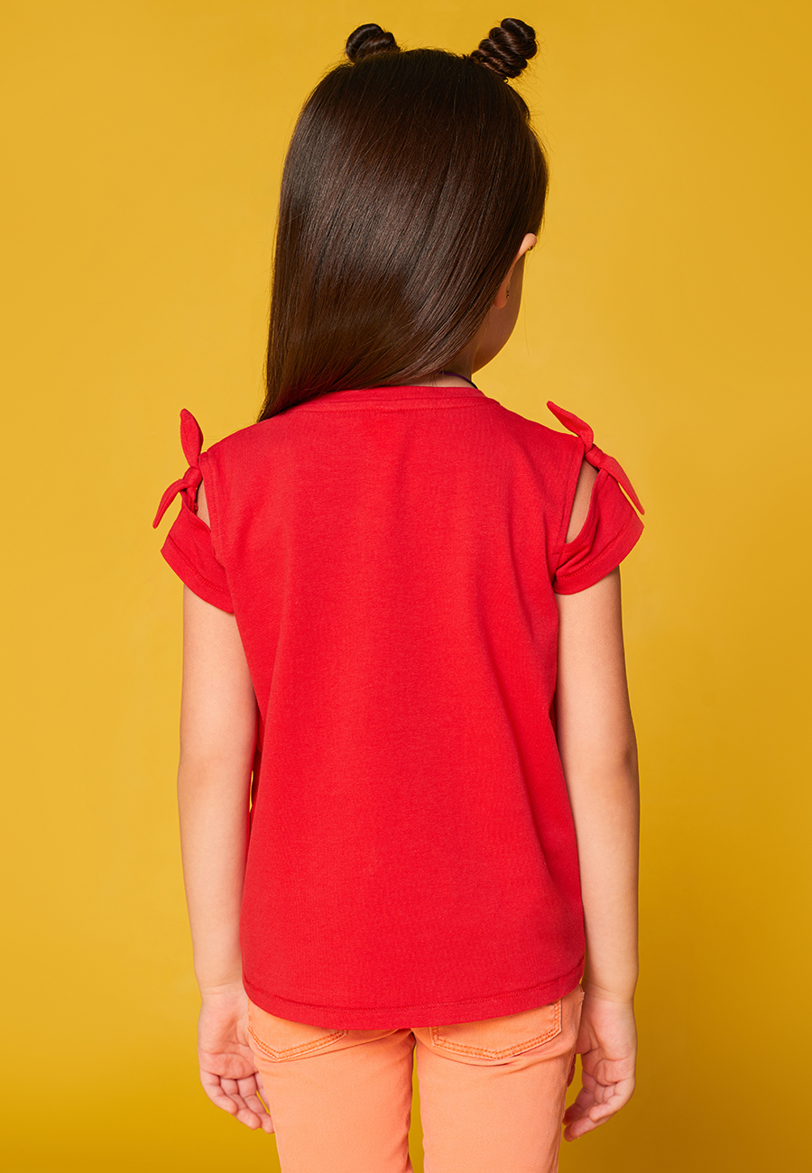 Футболка с круглым вырезом, красного цвета, украшена принтом спереди.