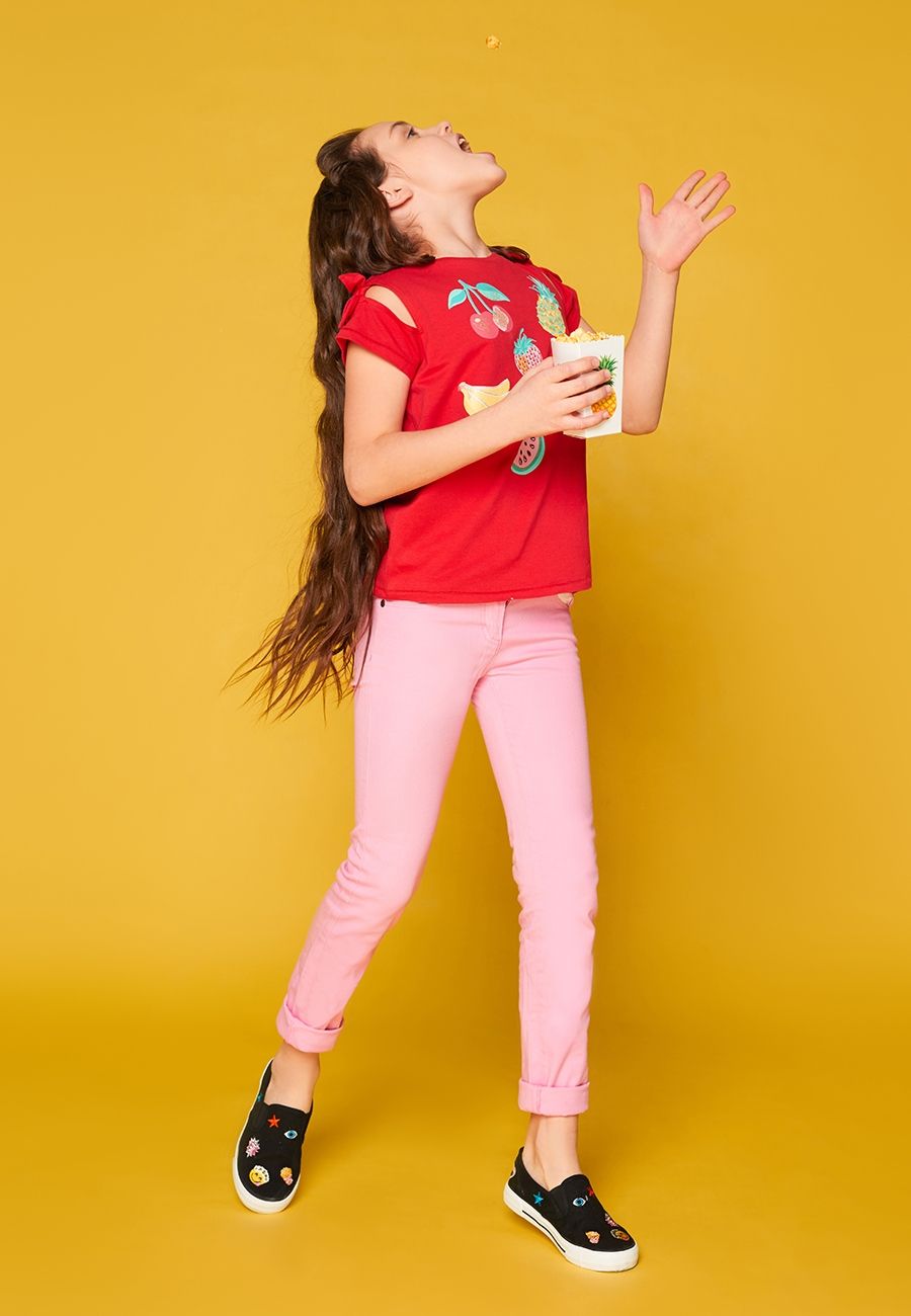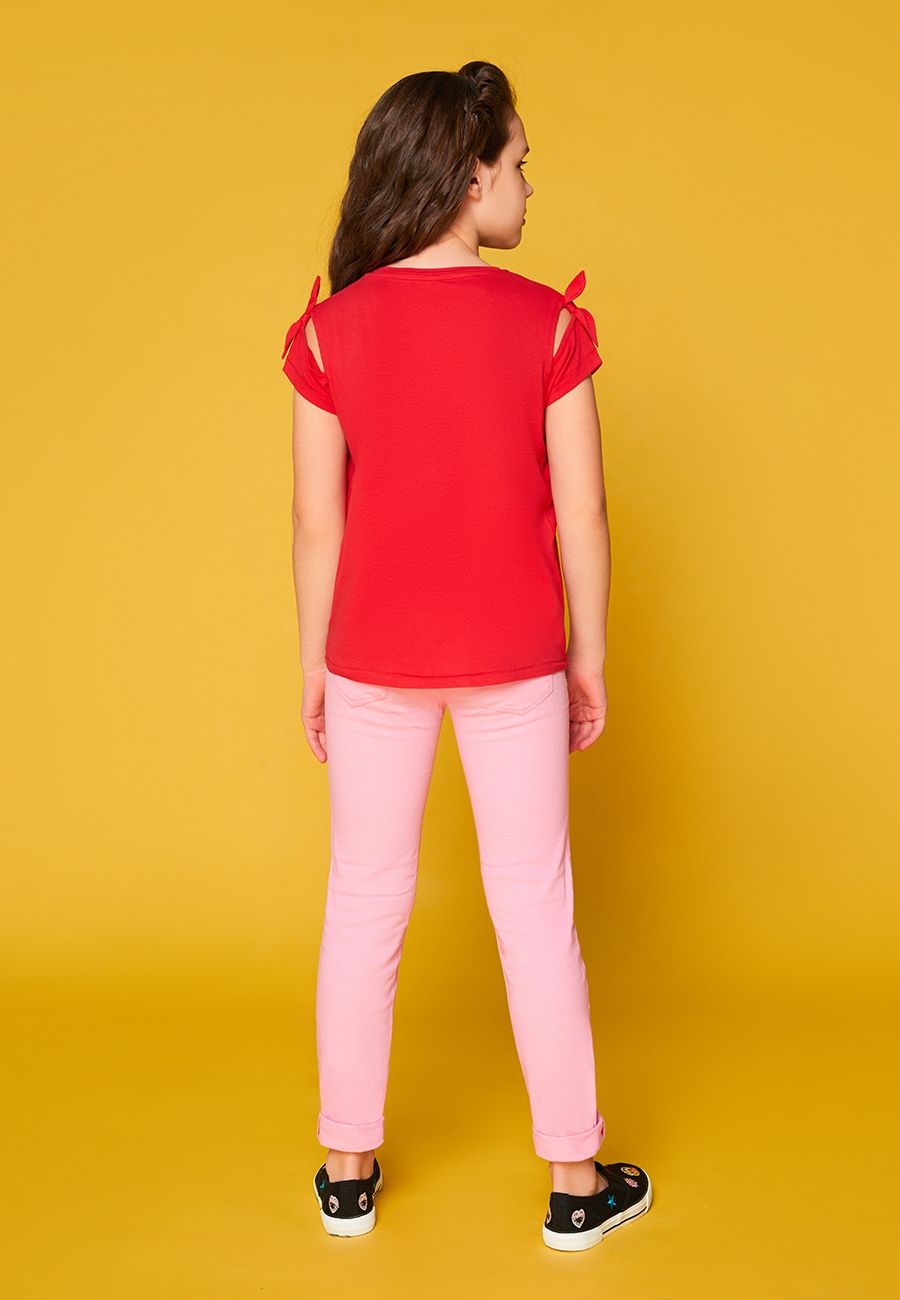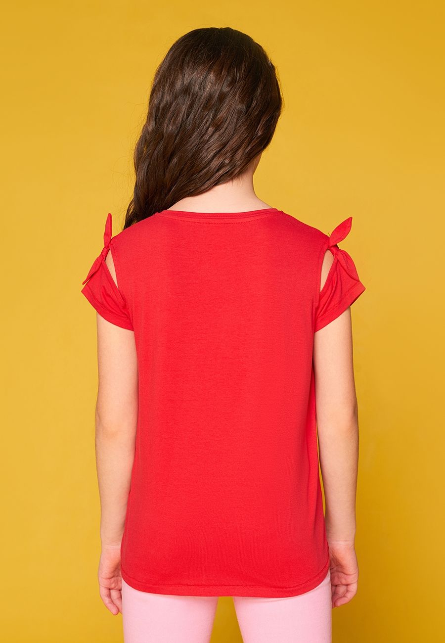Футболка с круглым вырезом, красного цвета, украшена принтом спереди.