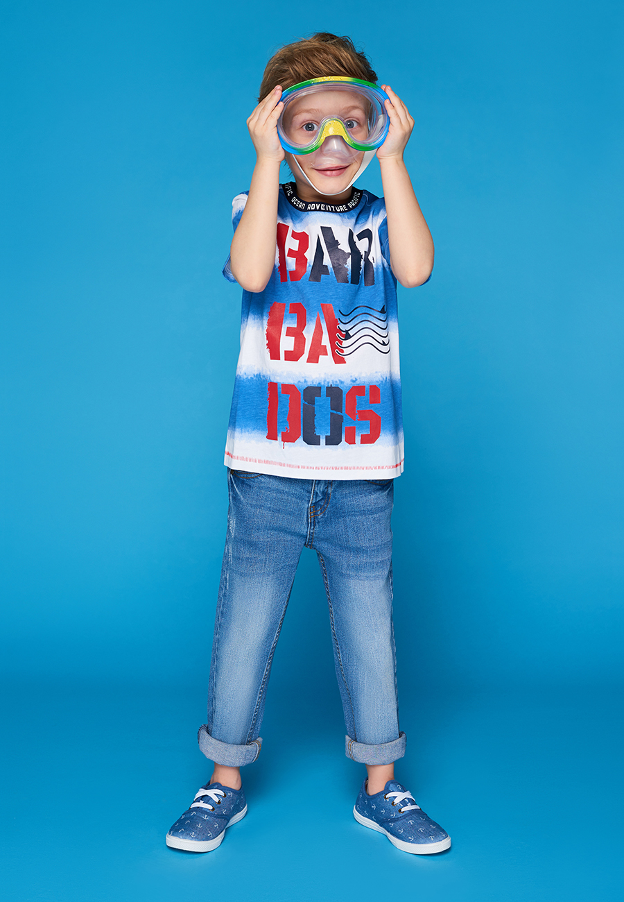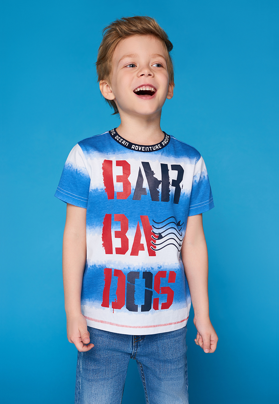 Футболка детская для мальчика. Горловина и полочкак со шрифтовым принтом.