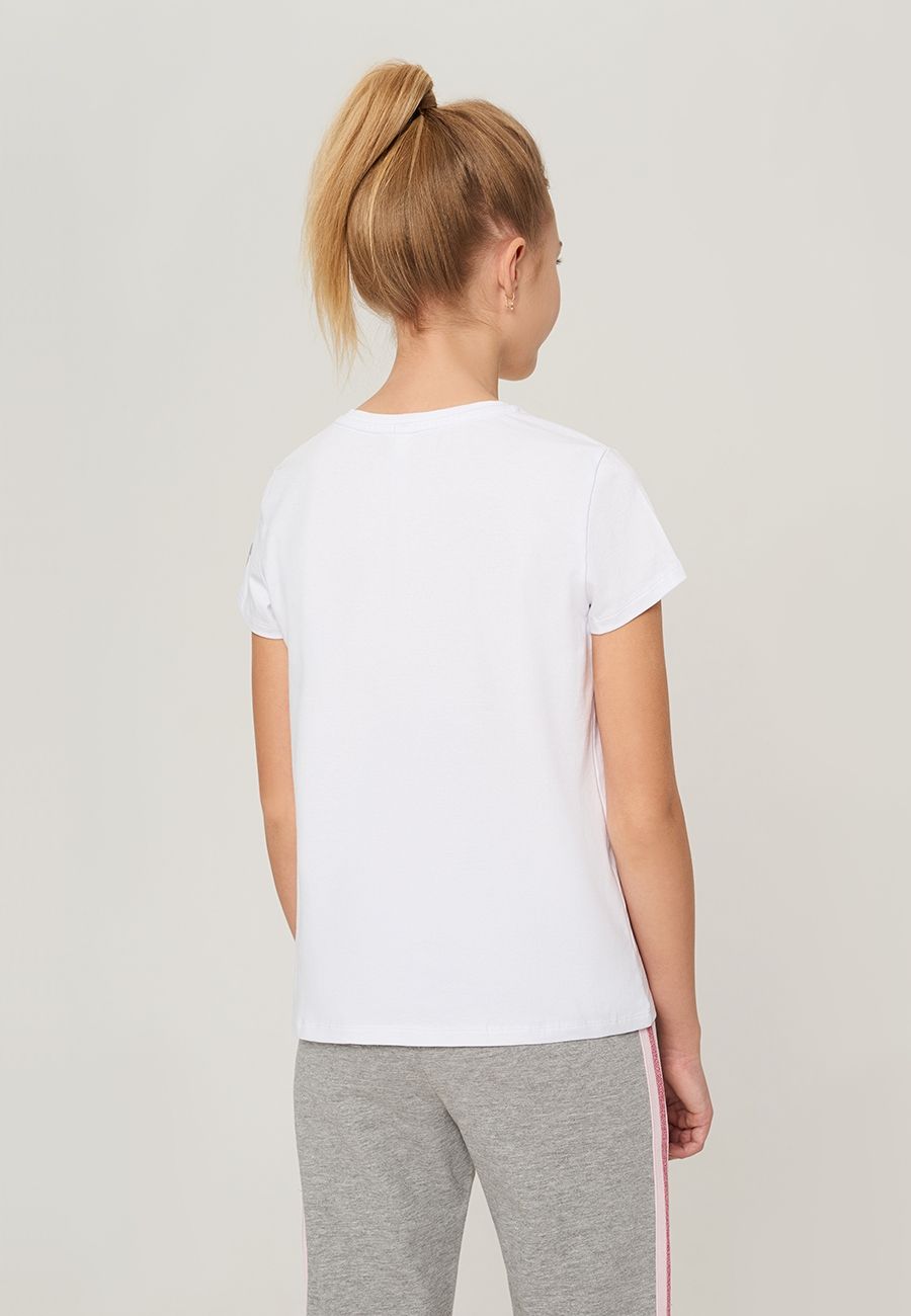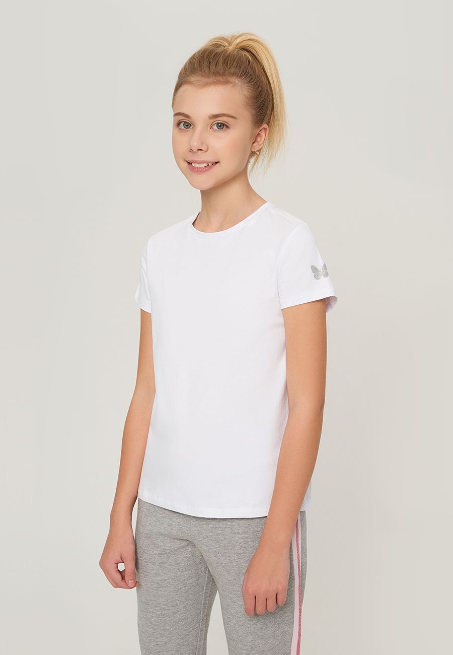 Трикотажная футболка с коротким рукавом для девочки. Рукав украшен маленьким блестящим принтом бабочкой. Лаконичный вариант для активной девочки.