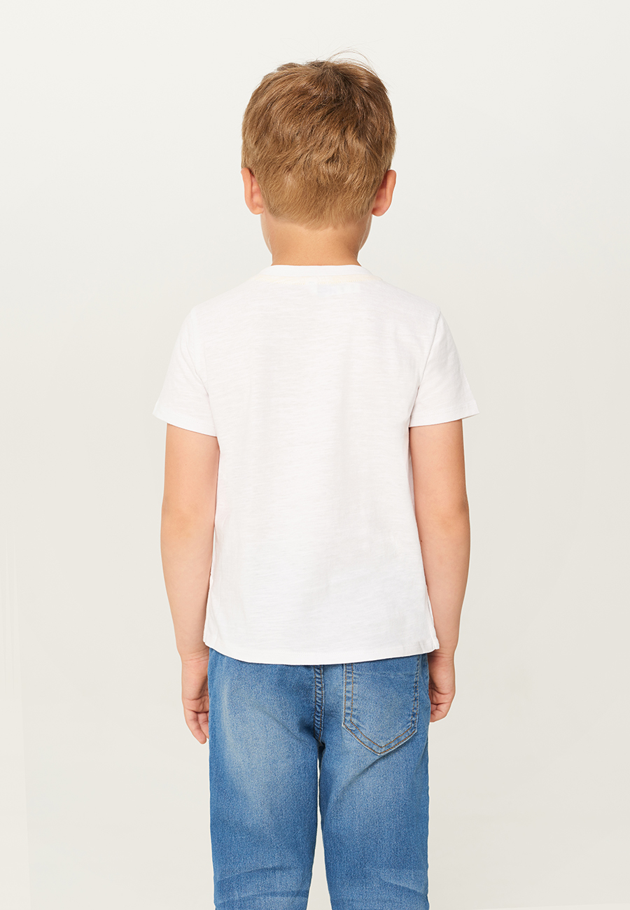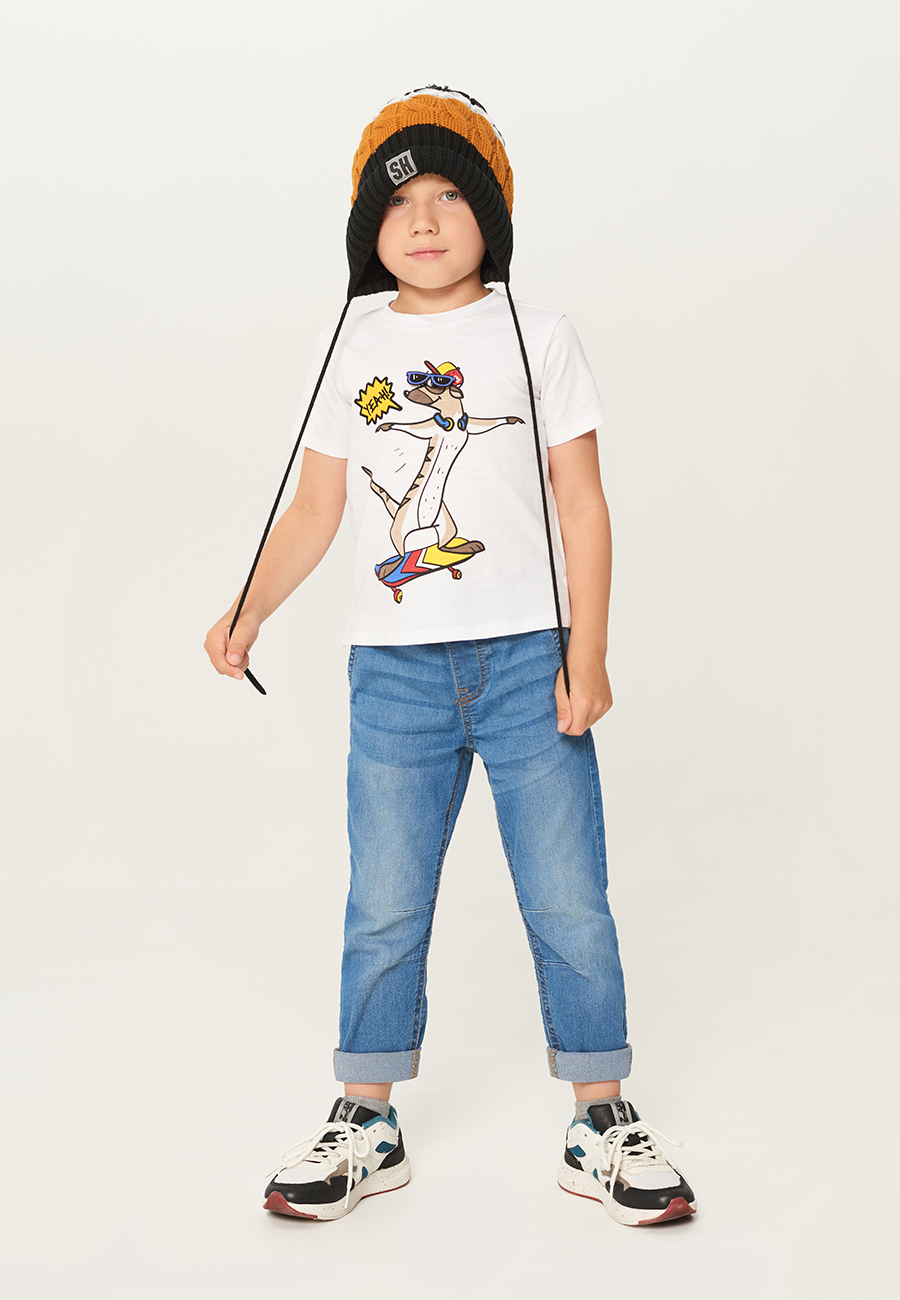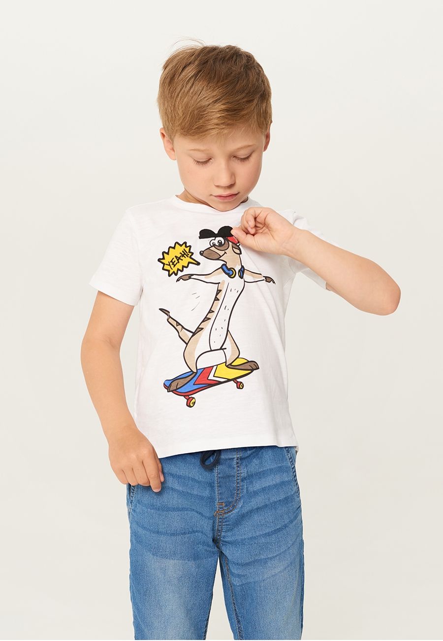 Белая трикотажная футболка с коротким рукавом для мальчика. Весёлый принт на полочке дополнен оригинальной деталью из фетра - поднимающиеся очки. Асимметричный низ футболки с удлинённой спинкой дополнен разрезами по бокам. Классное решение для маленьких модников.
