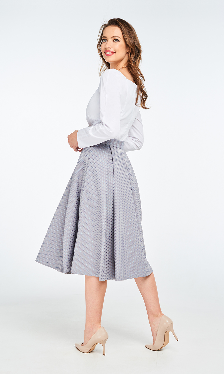 Серая юбка Yanita ниже колена выполнена сборчатым приёмом, благодаря чему "играет" складками при движении.